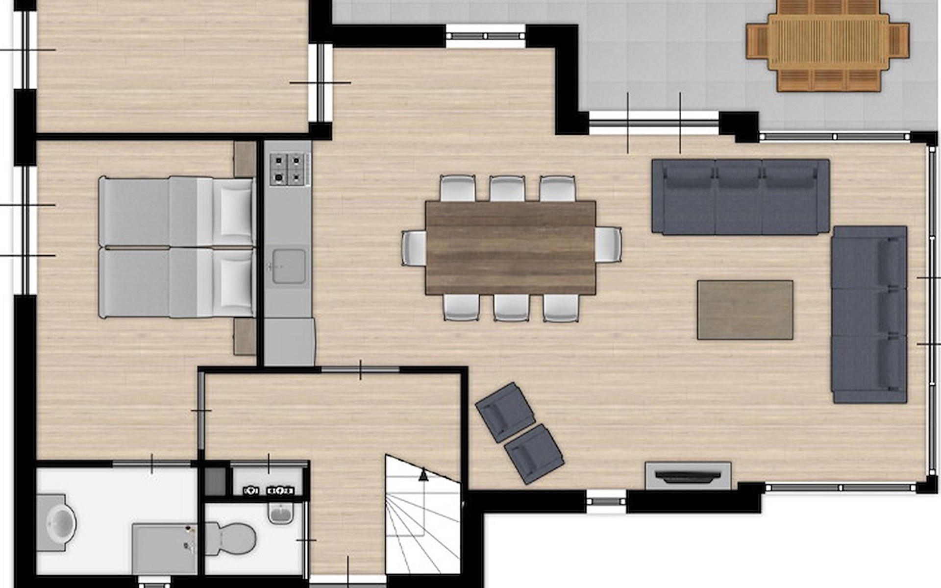 Das Wohnzimmer ist mit einer Sitzecke und einem Fernseher ausgestattet. Angrenzend befindet sich die offene Küche mit dem Essecke. Die Küche verfügt u.a. über einen Kühlschrank mit Gefrierfach, Mikrowelle, Geschirrspülmaschine und Filterkaffeemaschine.