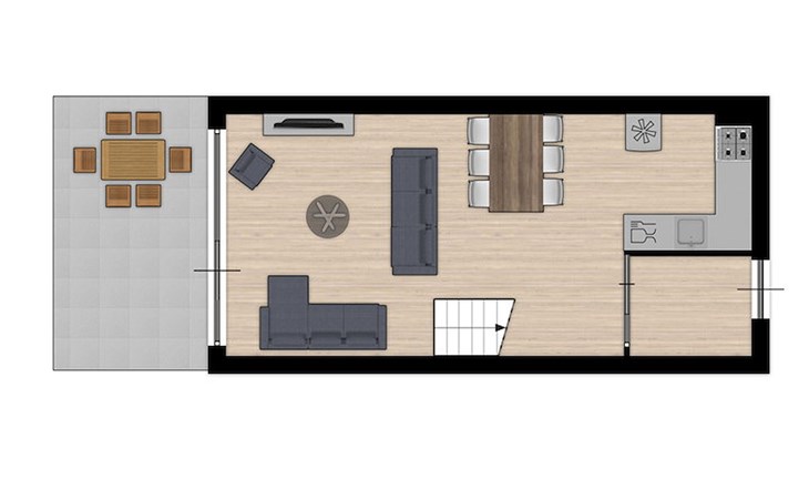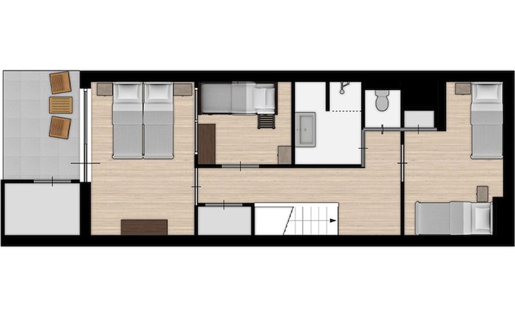 Die Comfort 6A-Wohnungen befinden sich im Erdgeschoss und im ersten Stock. Die Wohnung verfügt über eine möblierte Terrasse oder einen Balkon.