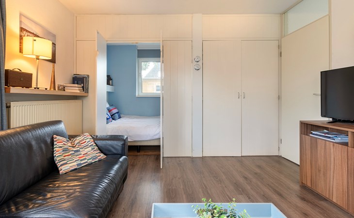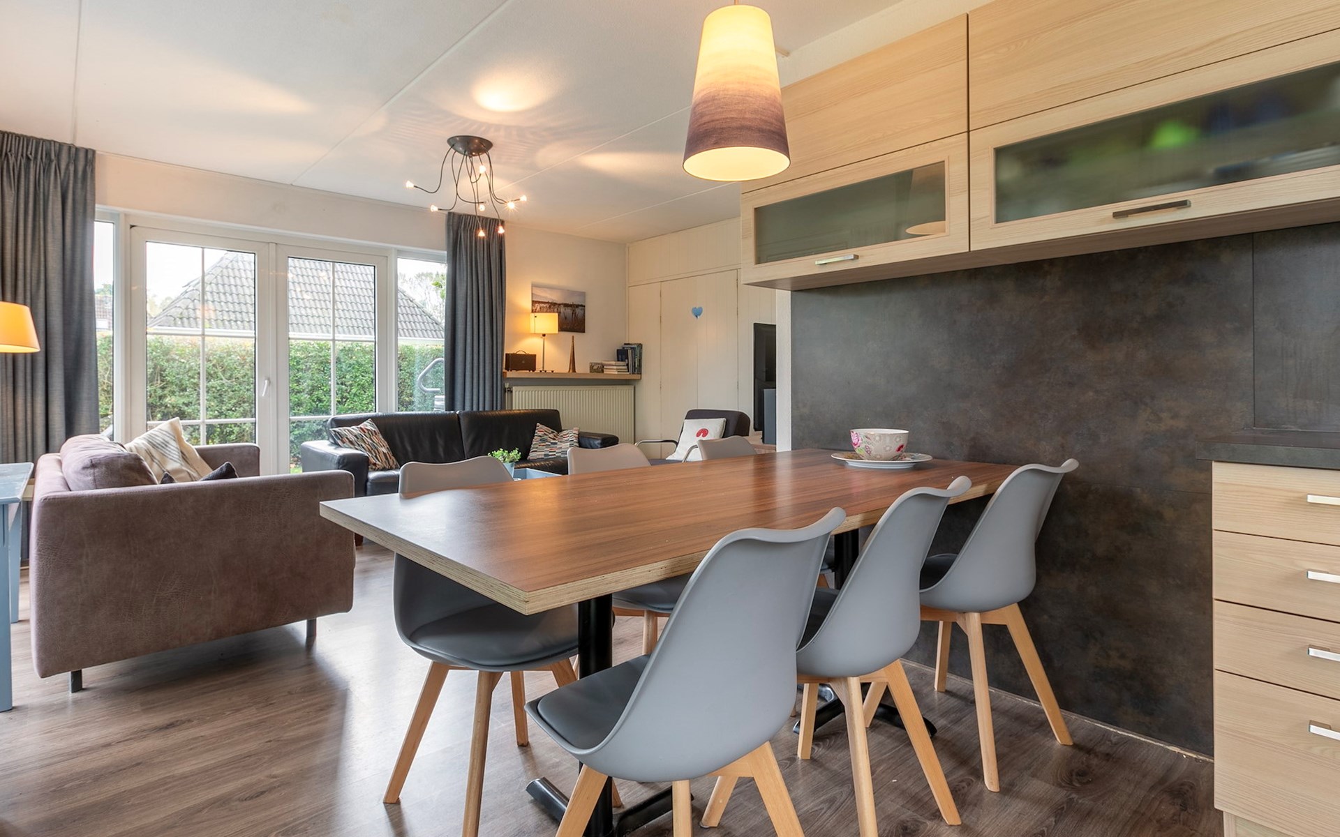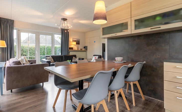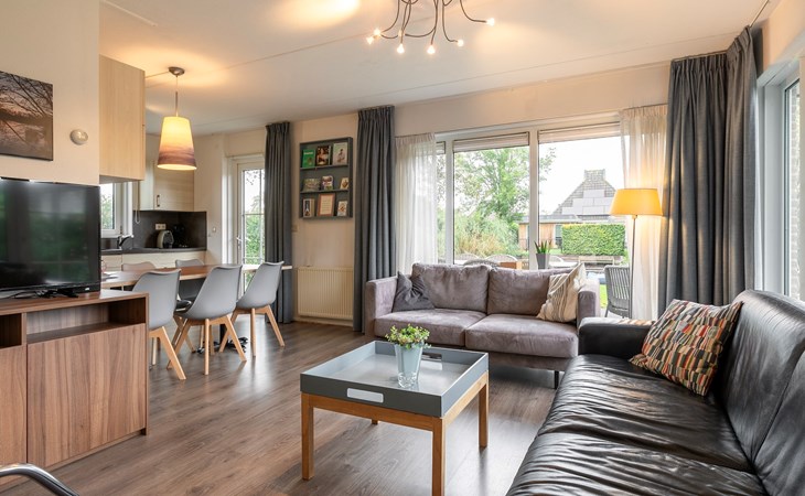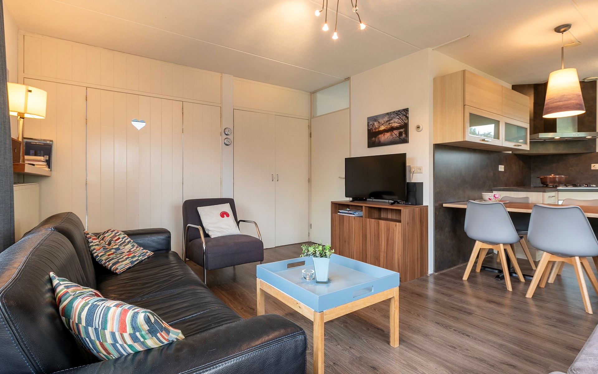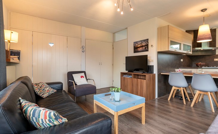 Das Wohnzimmer ist mit einer Sitzecke und einem Fernseher ausgestattet. In einem separaten Teil des Wohnzimmers befindet sich ein gemütliches Bettgestell mit Schlafmöglichkeiten für 2 Erwachsene. Der Bungalow verfügt über eine offene Küche mit Essbereich. Die Küche ist u.a. mit einer Kühl-Gefrierkombination, Backofen, Mikrowelle, Filterkaffeemaschine, Senseo-Maschine, Nespresso-Maschine und Geschirrspülmaschine ausgestattet.