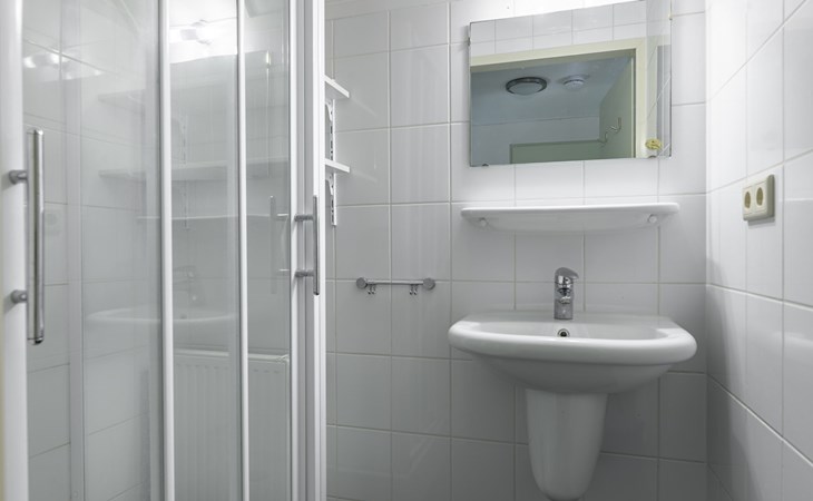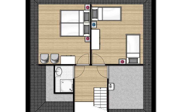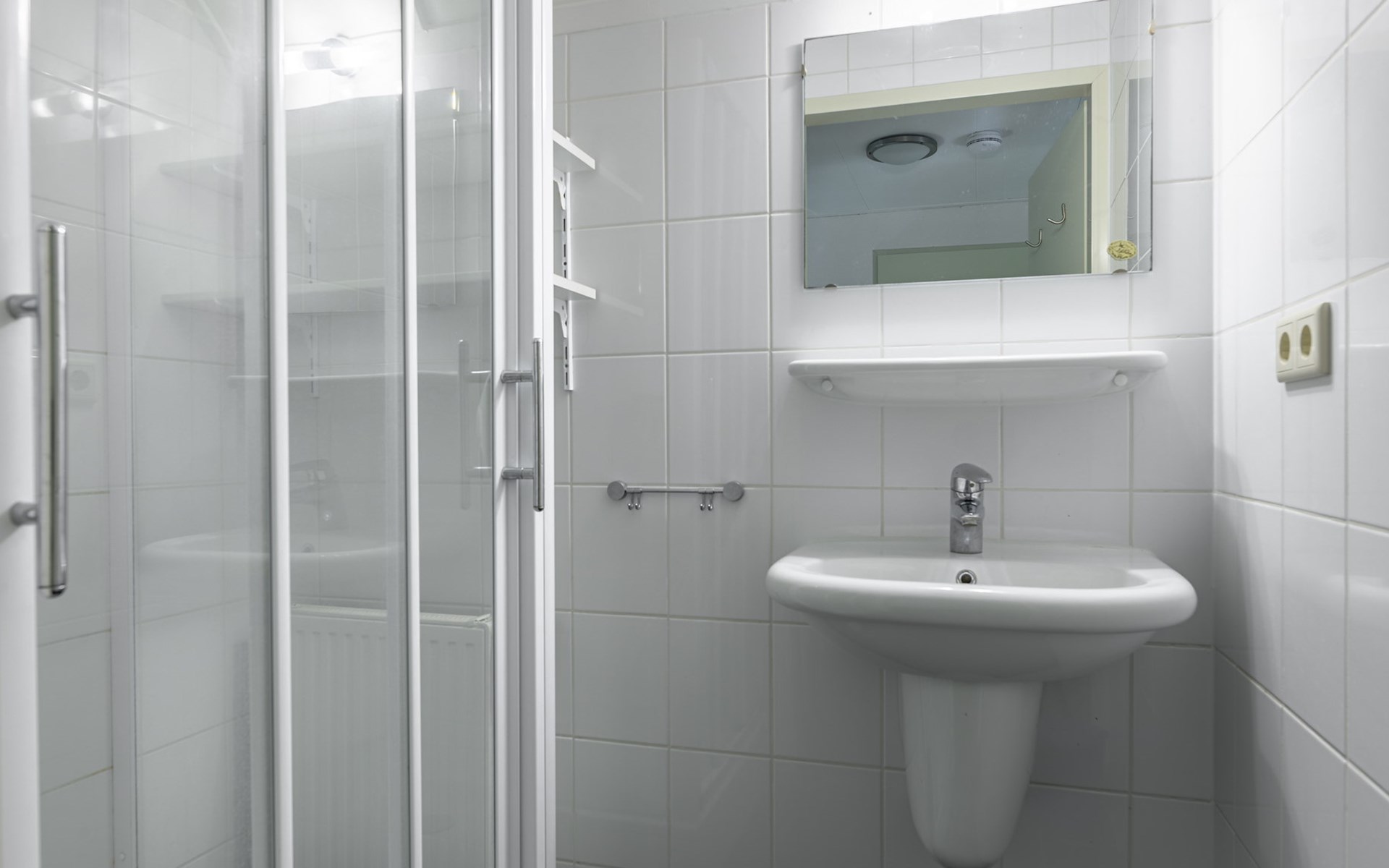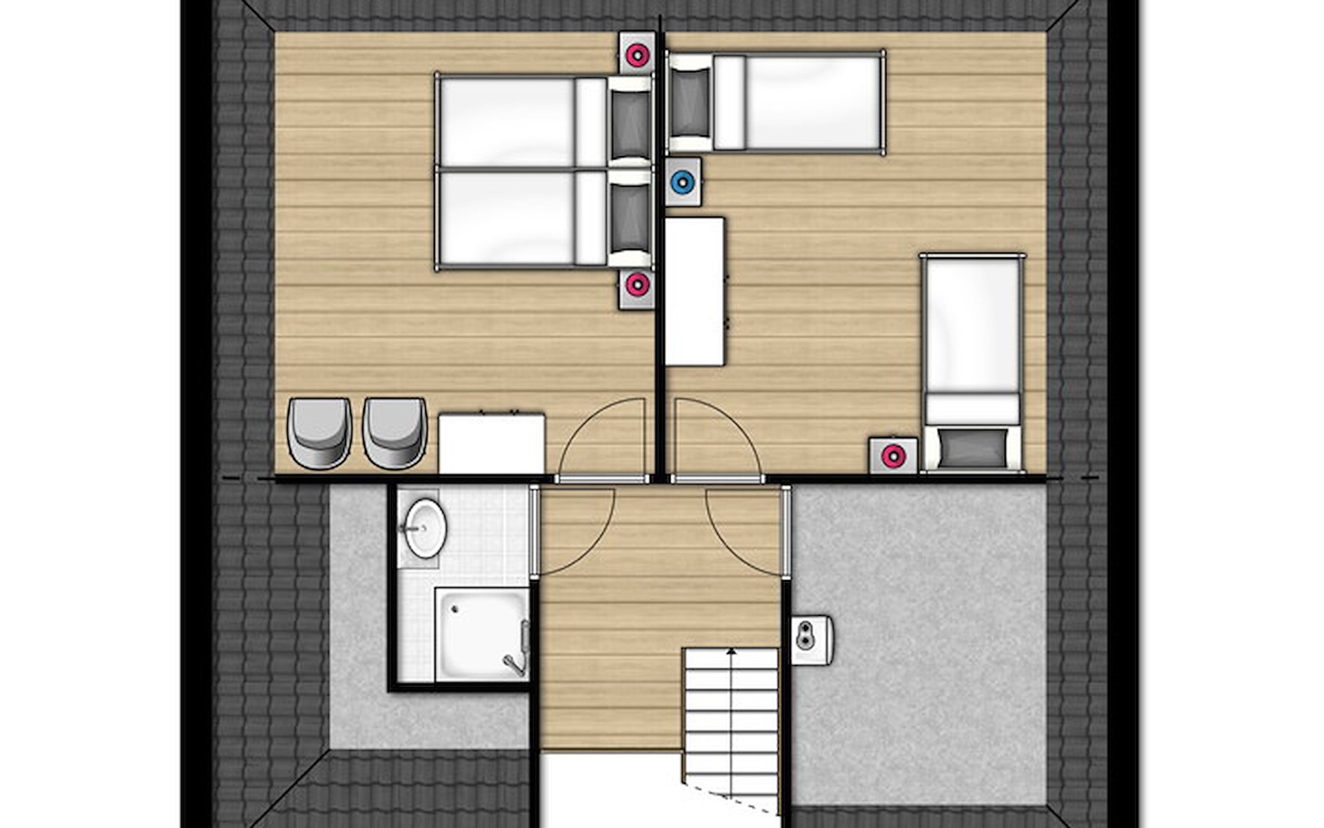 Im ersten Stock gibt es 2 Schlafzimmer und 1 Badezimmer. Beide Schlafzimmer haben 2 Einzelbetten. Das Badezimmer hat eine Dusche und ein Waschbecken.