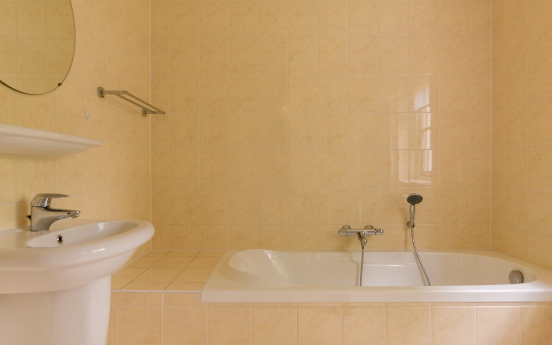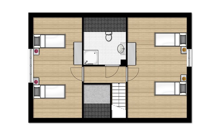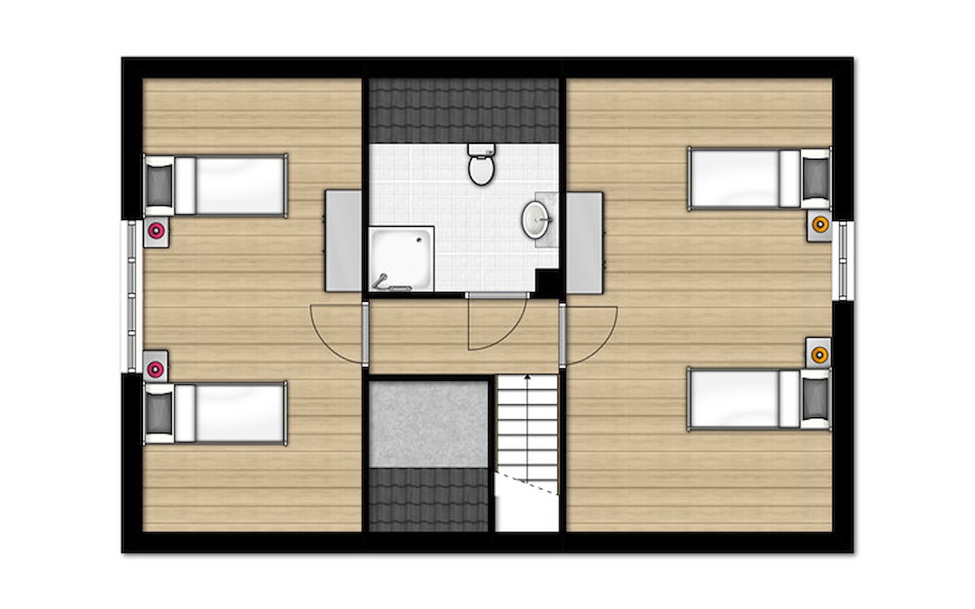Im ersten Stock gibt es 2 Schlafzimmer und 1 Badezimmer. Beide Schlafzimmer haben 2 Einzelbetten. Das Badezimmer hat eine Dusche, Waschbecken und Toilette.