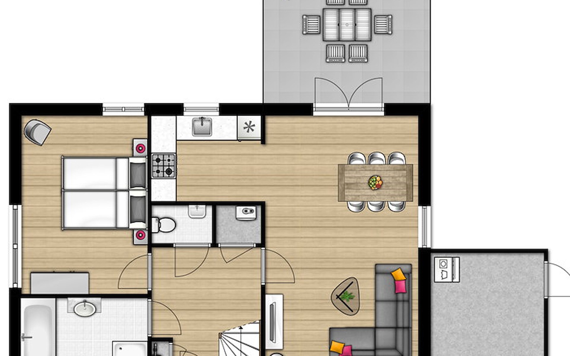 Es gibt 1 Schlafzimmer und 1 Badezimmer im Erdgeschoss. Das Schlafzimmer hat 2 Einzel-Boxspringbetten. Das Badezimmer hat eine Badewanne, eine Dusche und ein Waschbecken. Es gibt auch eine separate Toilette. Die Villa hat auch einen Abstellraum mit einer Waschmaschine.