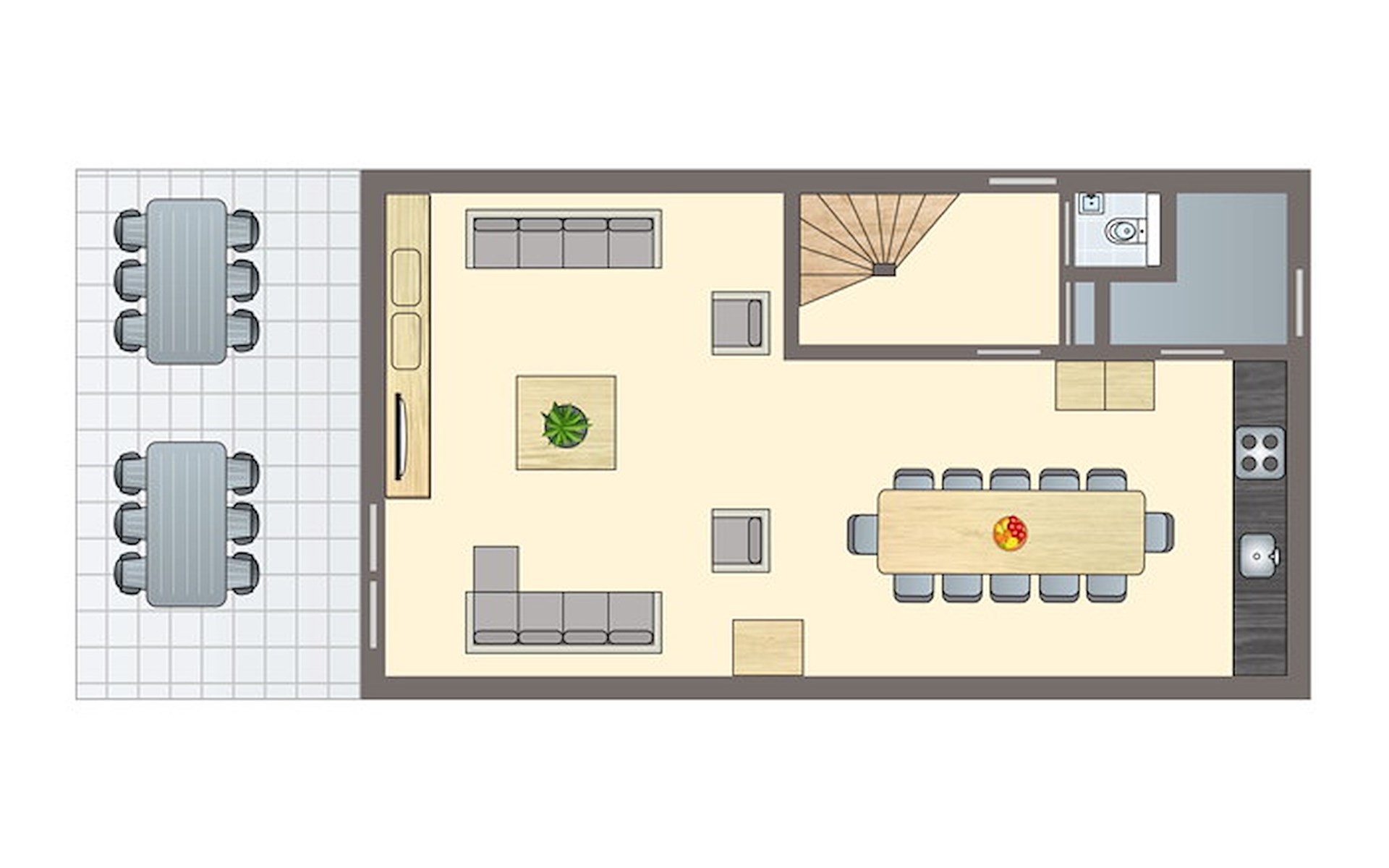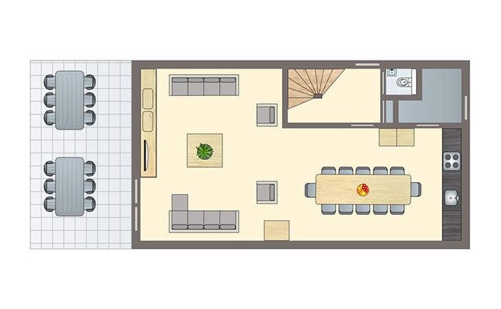 Das Wohnzimmer ist mit einer Sitzecke, Fernseher, CD- und DVD-Player und einem Radio ausgestattet. Der Bungalow verfügt über eine offene Küche mit Essecke für 12 Personen. Die Küche ist u.a. mit einem Kühlschrank mit Gefrierfach, einer Nespresso-Kaffeemaschine, Mikrowelle und einer Geschirrspülmaschine ausgestattet.