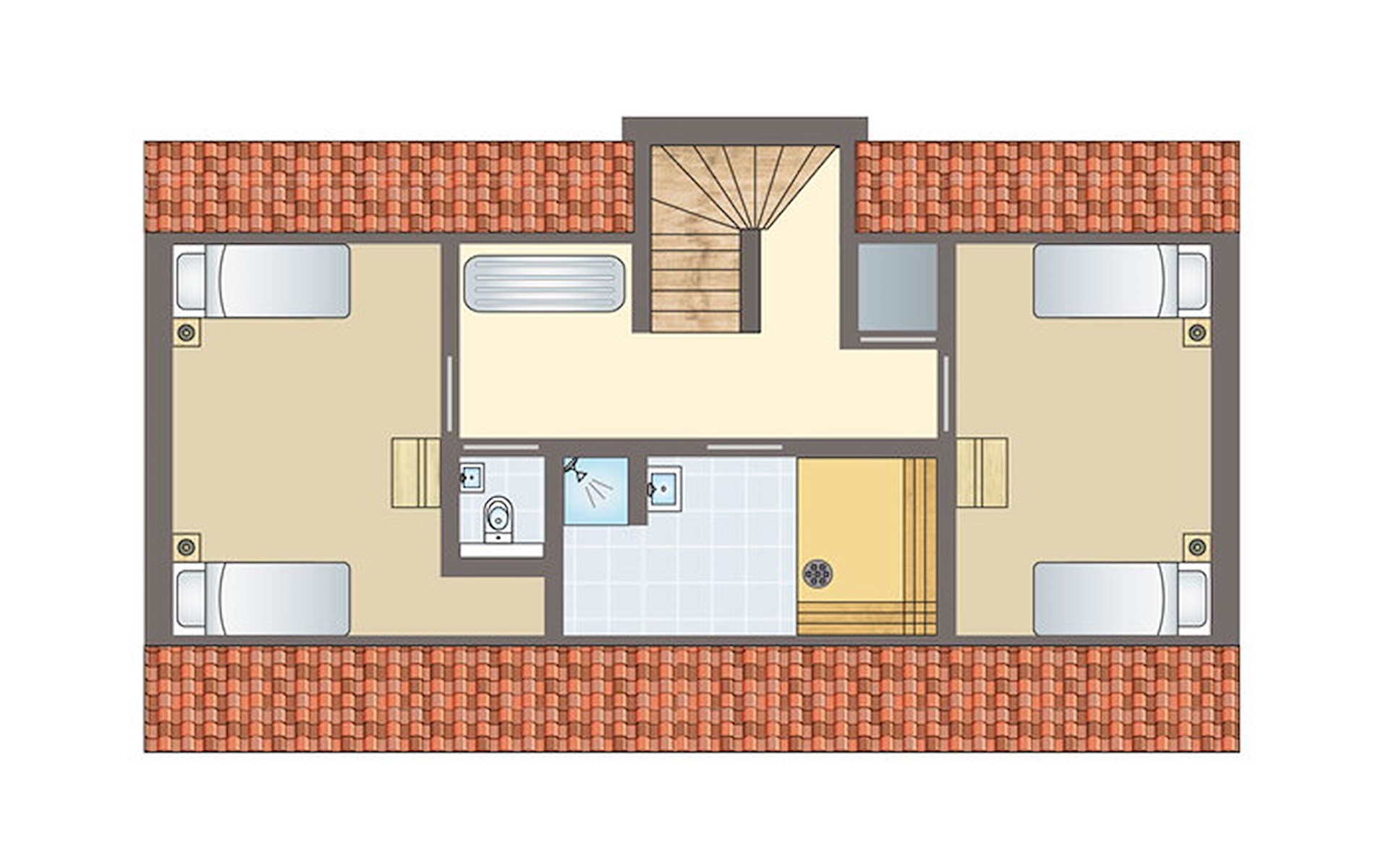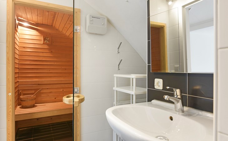 In der zweiten Etage befinden sich 2 Schlafzimmer und 1 Badezimmer. In beiden Schlafzimmern stehen 2 Einzel-Boxspringbetten. Das Badezimmer verfügt über eine Duschkabine und ein Waschbecken. Dieses Badezimmer verfügt auch über eine private Sauna. Auf dieser Etage gibt es auch eine Sonnenbank.