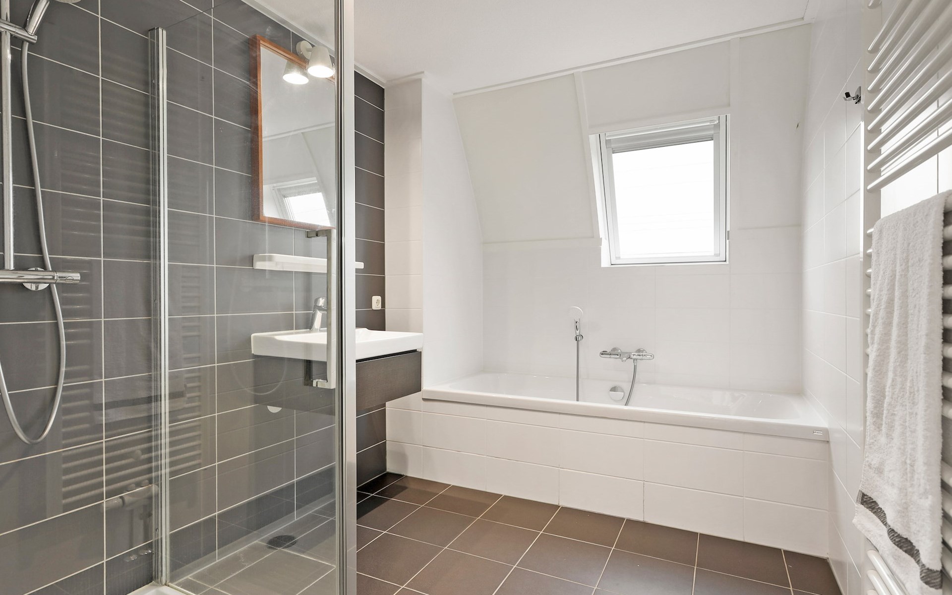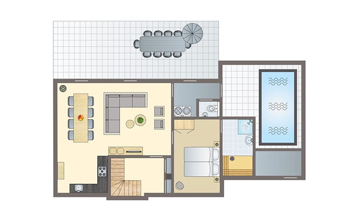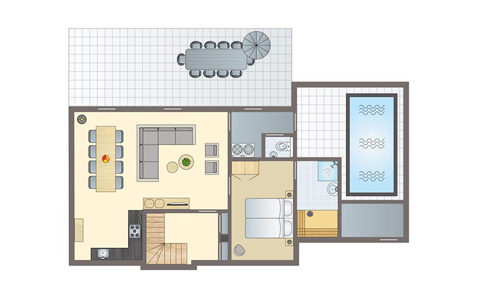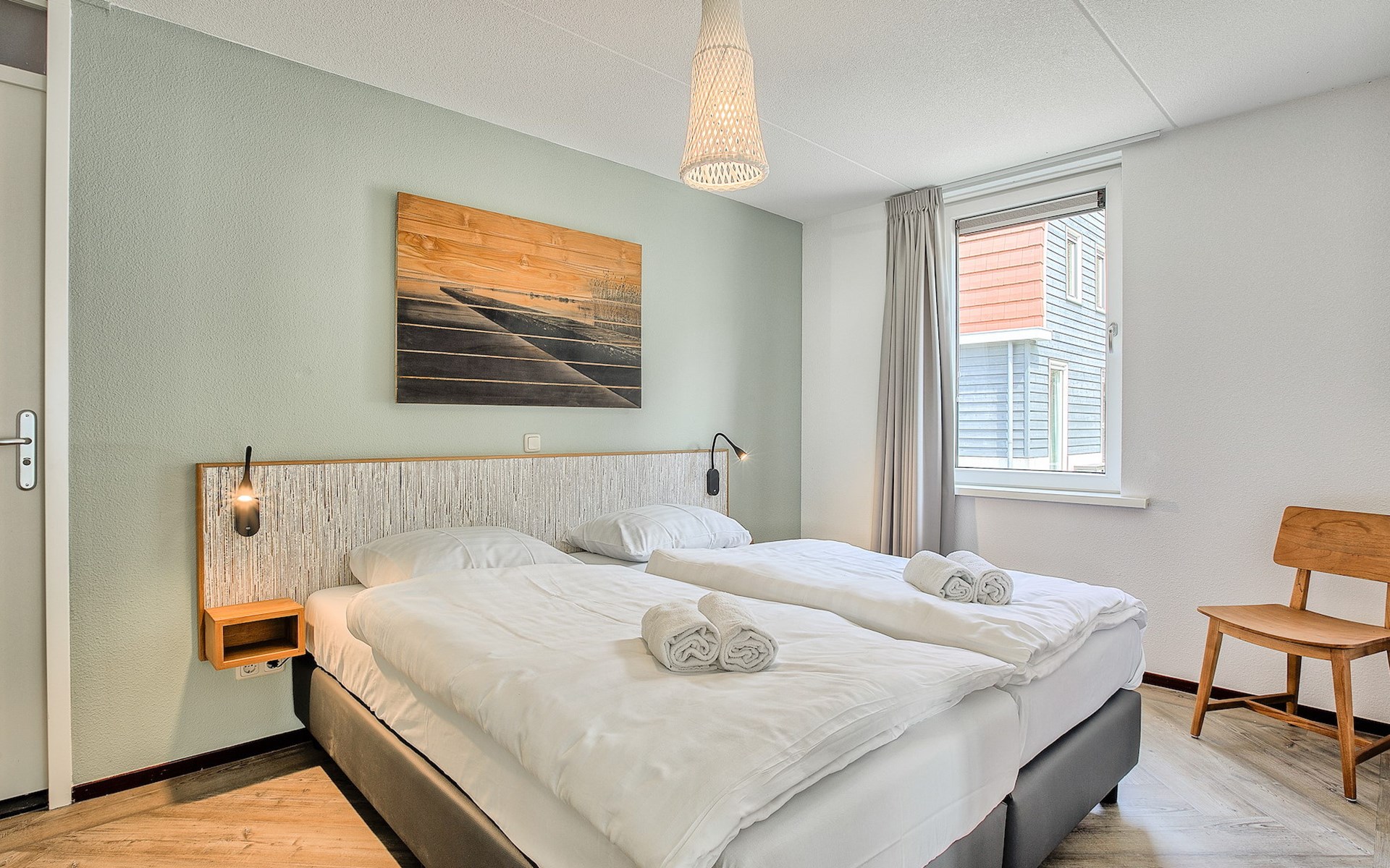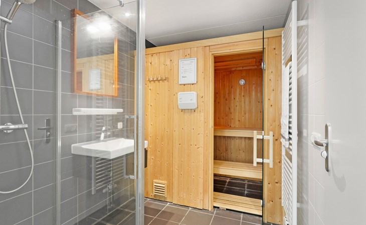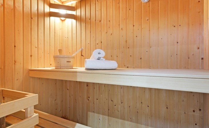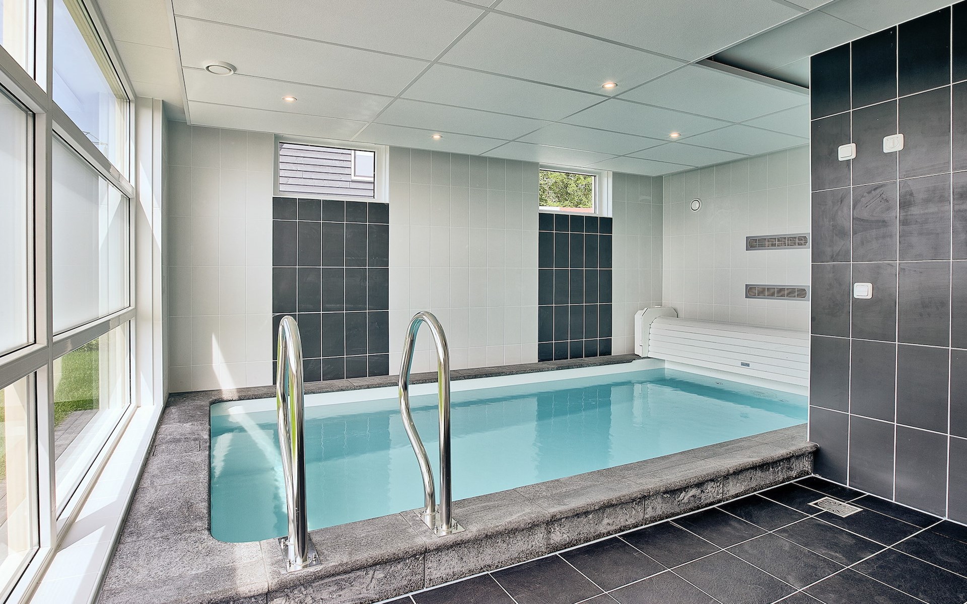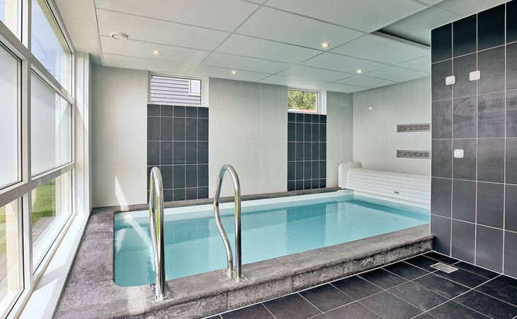 Im Erdgeschoss befindet sich 1 Schlafzimmer mit 2 Einzel-Boxspringbetten, einem 2-Personen-Softtopper und einen Fernseher. Das Badezimmer im Erdgeschoss verfügt über eine flache Dusche/Regendusche und ein Waschbecken. In diesem Badezimmer gibt es auch eine Sauna. Außerdem gibt es eine separate Toilette. Außerdem gibt es im Erdgeschoss einen überdachten Privatpool mit Jetstream.