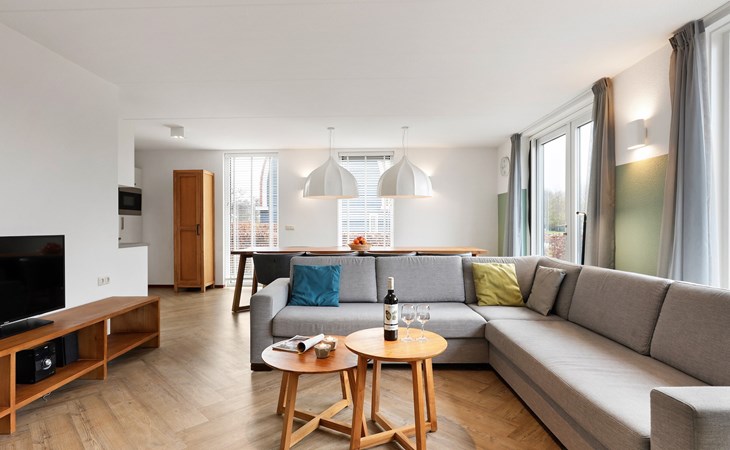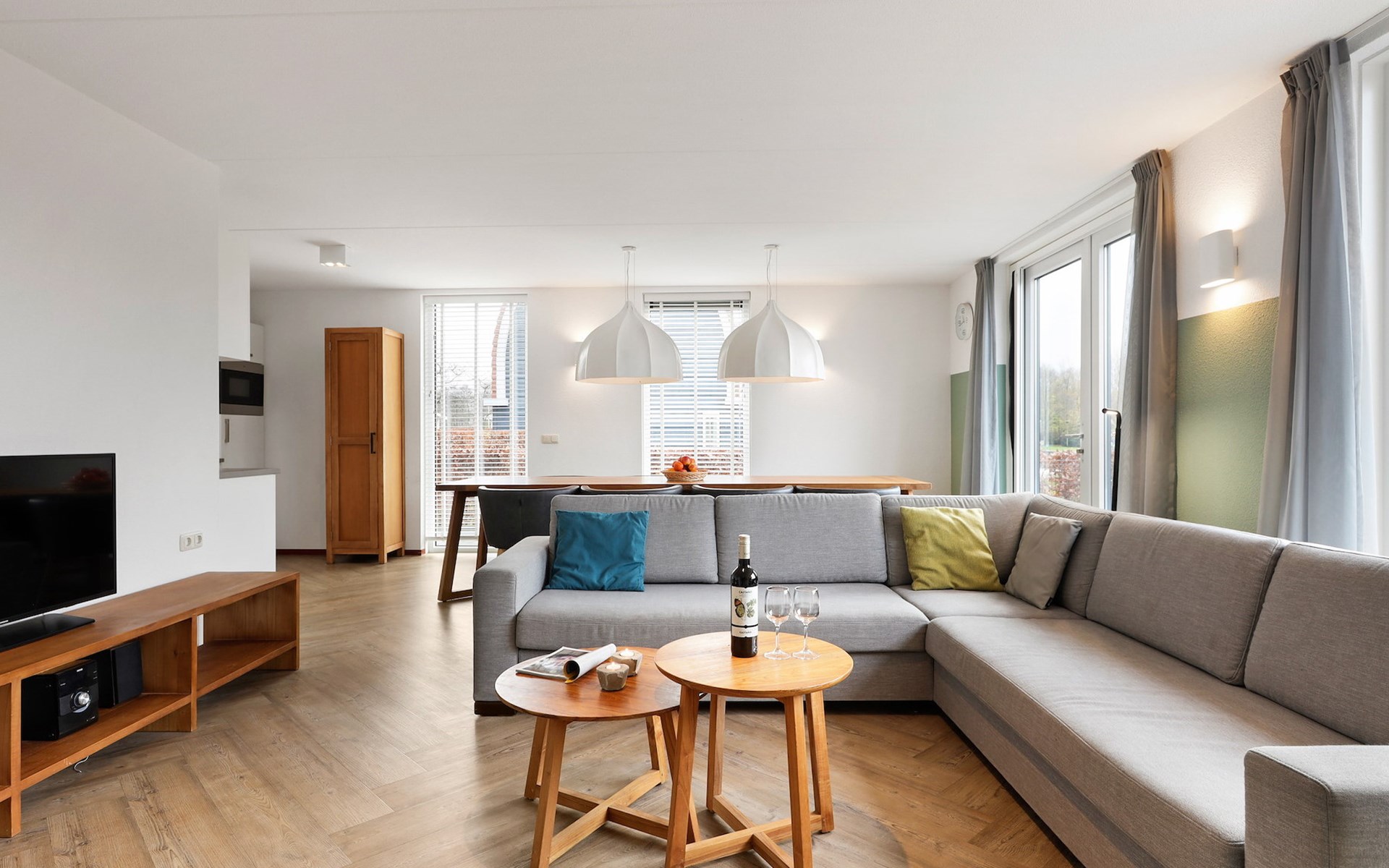 Das Wohnzimmer ist mit einer Sitzecke, Fernseher, CD- und DVD-Player und Radio ausgestattet. Der Bungalow verfügt über eine offene Küche mit Essecke. Die Küche ist u.a. mit einem Kühlschrank mit Gefrierfach, einer Nespresso-Kaffeemaschine, Mikrowelle und einer Geschirrspülmaschine ausgestattet. Außerdem gibt es einen zusätzlichen Kühlschrank im Abstellraum und eine Waschmaschinen/Wäschetrockner-Kombination.