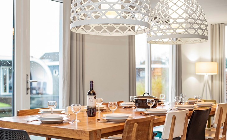 Das Wohnzimmer ist mit einer Sitzecke, Fernseher, CD- und DVD-Player und Radio ausgestattet. Der Bungalow verfügt über eine offene Küche mit Essecke. Die Küche ist u.a. mit einem Kühlschrank mit Gefrierfach, einer Nespresso-Kaffeemaschine, Mikrowelle und einer Geschirrspülmaschine ausgestattet. Im Erdgeschoss gibt auch eine separate Toilette und einen Waschraum mit Waschmaschine und Wäschetrockner.