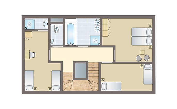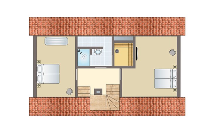 In der zweiten Etage gibt es 2 Schlafzimmer und 1 Badezimmer. In beiden Schlafzimmern stehen 2 Einzel-Boxspringbetten. In einem der Schlafzimmer steht eine Sonnenbank. Das Badezimmer verfügt über eine Duschkabine und ein Doppelwaschbecken. Dieses Badezimmer verfügt auch über eine Sauna.