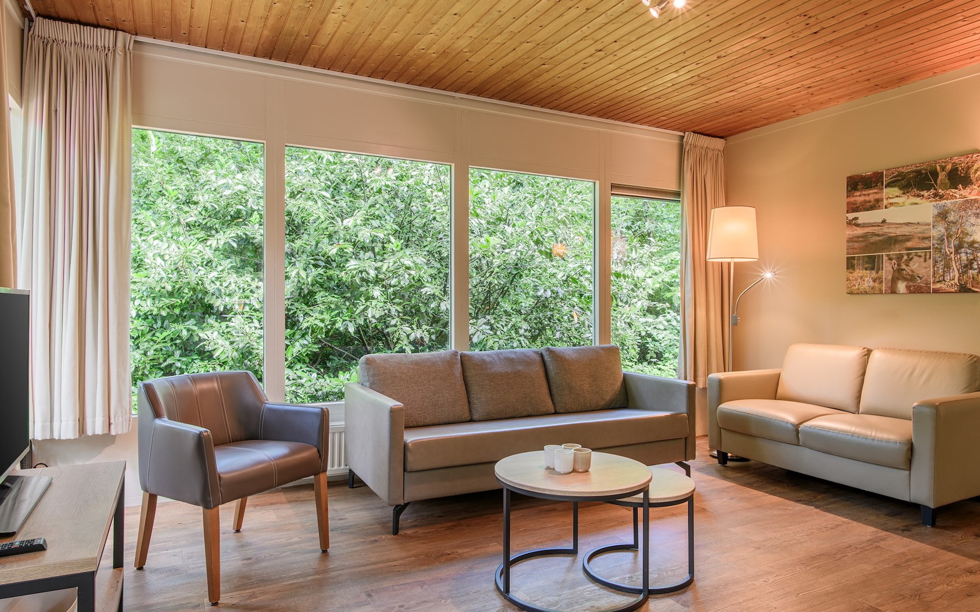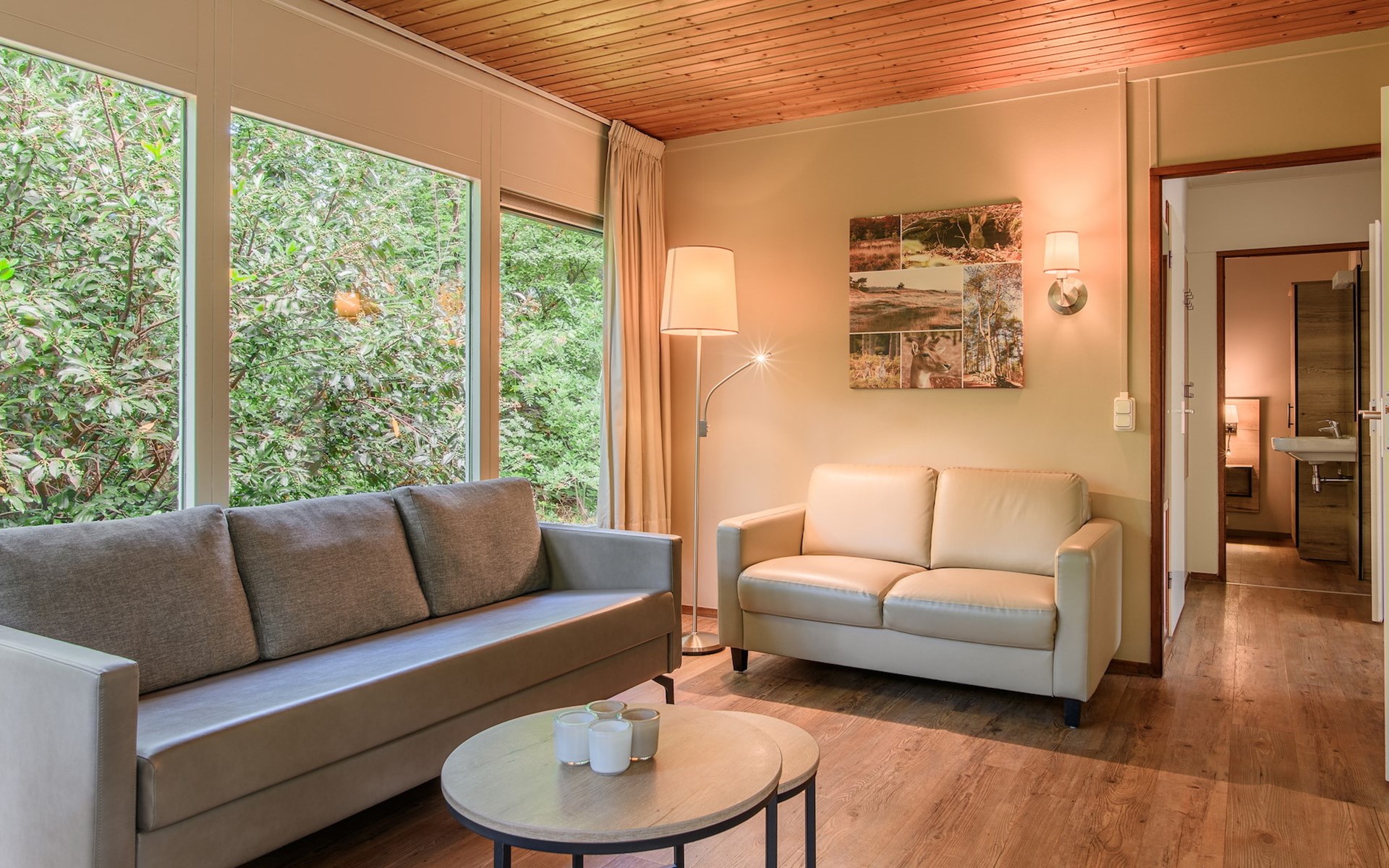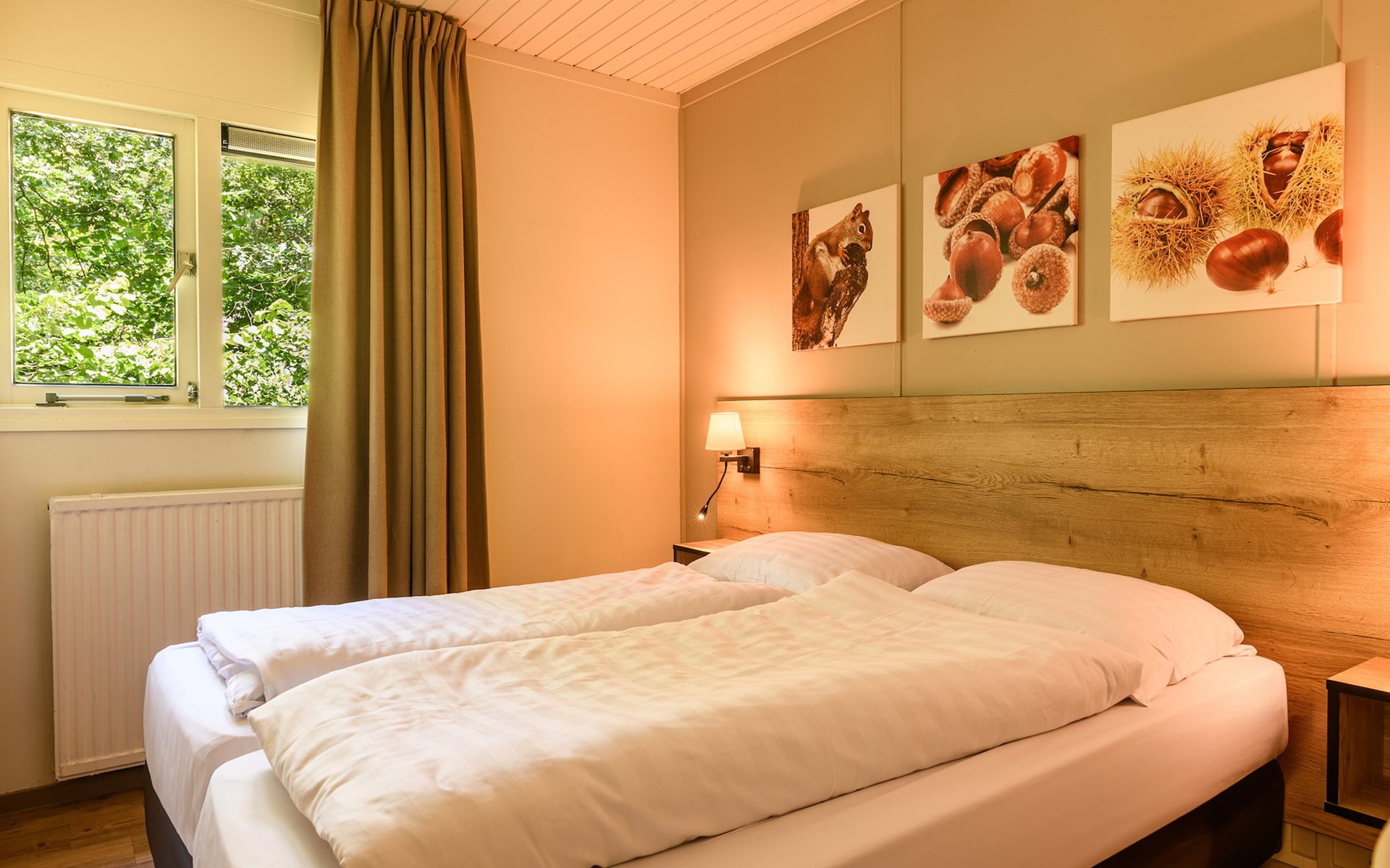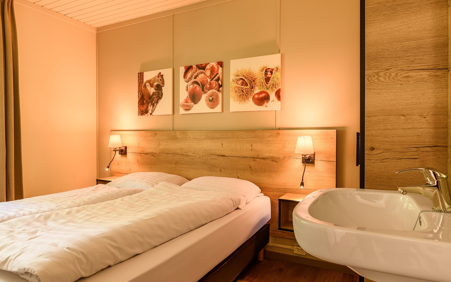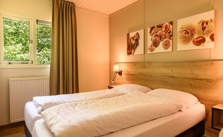 Bungalow 6B1 verfügt über 3 Schlafzimmer. Eines der Schlafzimmer hat 2 Einzel-Boxspringbetten und einen Fernseher. Die 2 anderen Schlafzimmer haben jeweils 2 Einzel-Boxspringbetten. Das Badezimmer verfügt über eine Dusche und ein Waschbecken und es gibt eine separate Toilette.