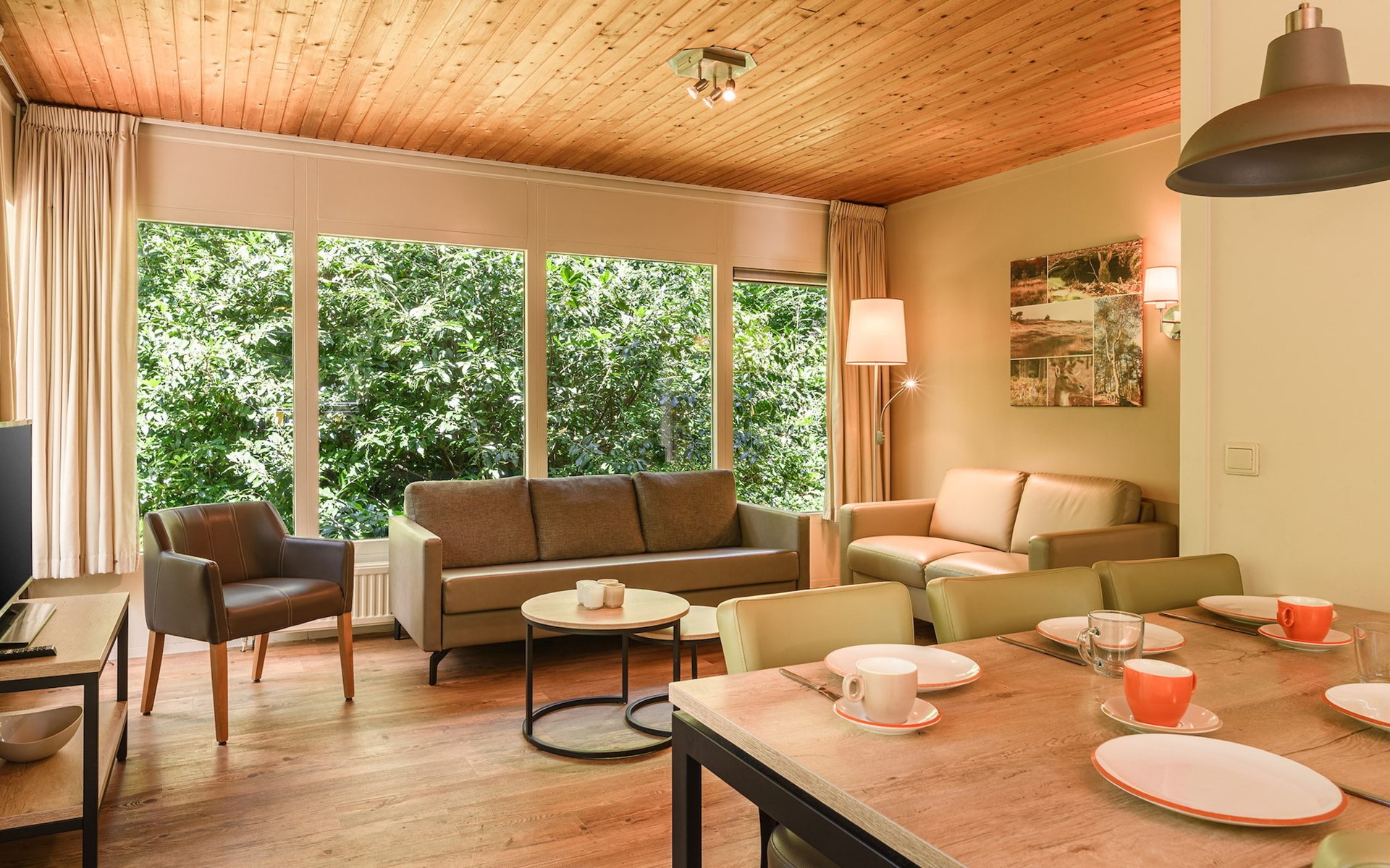 Der Bungalow hat eine offene Küche mit Essecke und ist u.a. mit einem Kühlschrank mit Gefrierfach, einer Filterkaffeemaschine, einer Mikrowelle und einer Geschirrspülmaschine ausgestattet. Das Wohnzimmer ist mit einer Sitzecke und Fernseher eingerichtet.