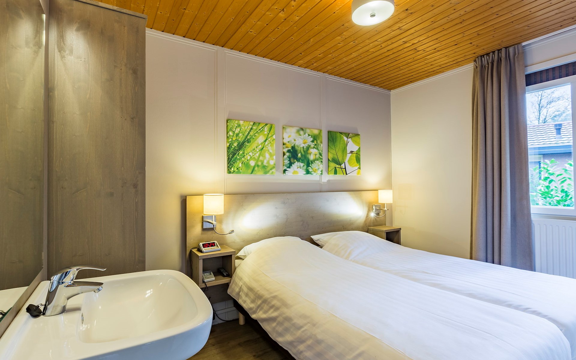 Der Bungalow verfügt über 2 Schlafzimmer. In 1 Schlafzimmer stehen 2 Einzel-Boxspringbetten mit einem 2-Personen-Soft-Topper, ein eigenes Waschbecken und ein Fernseher zur Verfügung. In den anderen beiden Schlafzimmern stehen 2 Einzel-Boxspringbetten. Das Badezimmer verfügt über eine ebene Dusche und ein Waschbecken. Außerdem gibt es eine separate Toilette. Im Freien befindet sich eine Terrasse mit Gartenmöbeln und ein Sonnenschirm.