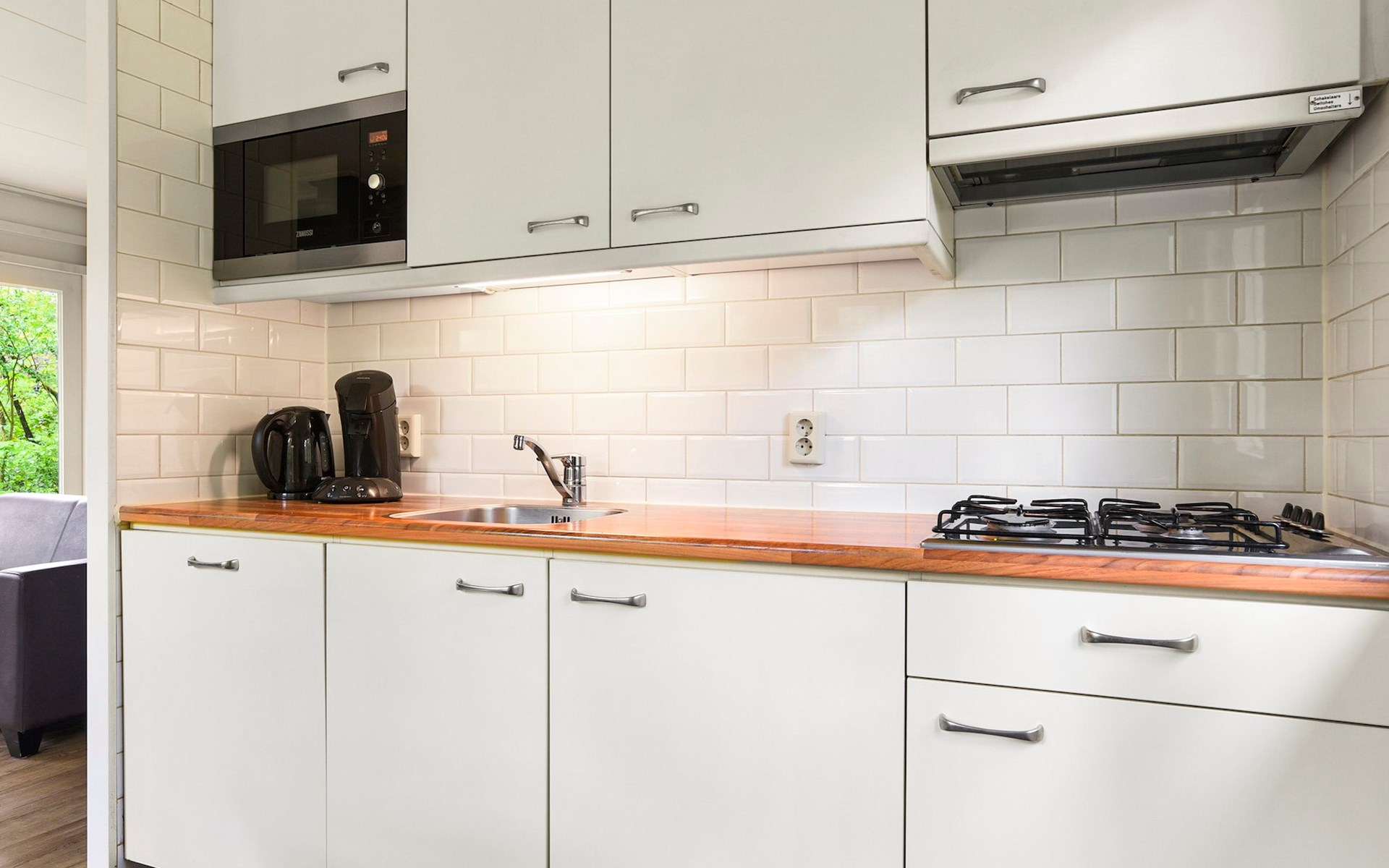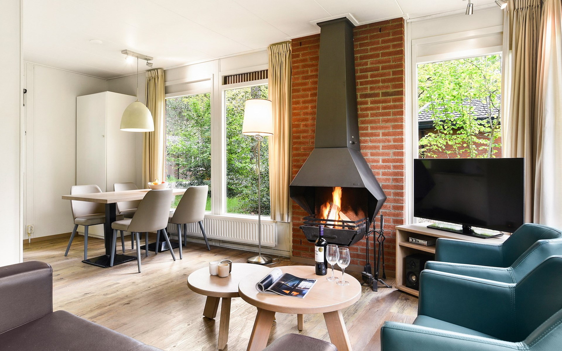 Das Wohnzimmer ist mit einer Sitzecke, einem Kamin und einem Fernseher ausgestattet und grenzt an die offene Küche mit Essecke. Die Küche ist u.a. mit einem Kühlschrank mit Gefrierfach, einer Mikrowelle, einer Filterkaffeemaschine, einer Senseo-Kaffeemaschine und eine Geschirrspülmaschine ausgestattet.