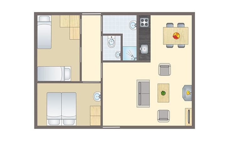 Die Unterkünfte können anders eingeteilt und eingerichtet sein. Grundrisse und Abbildungen dienen als Beispiele.