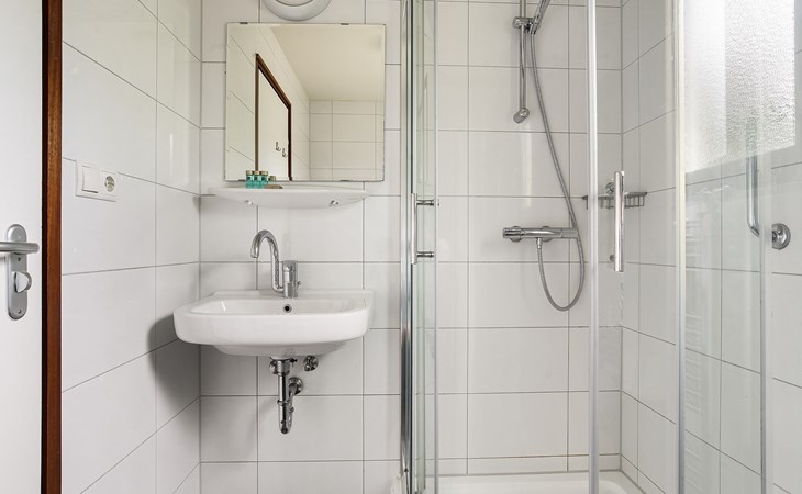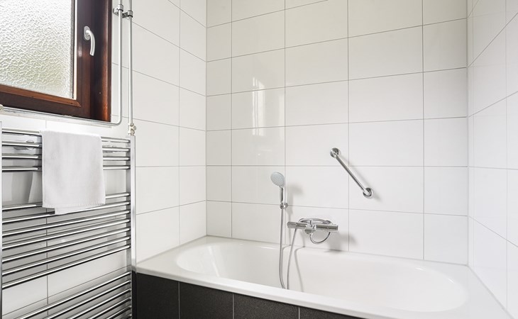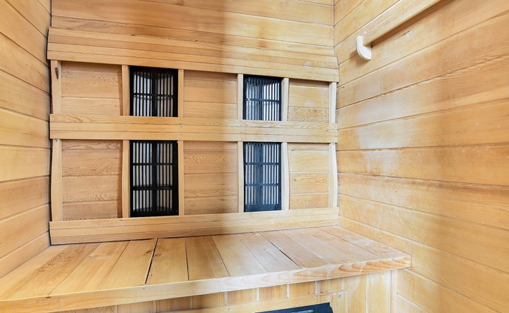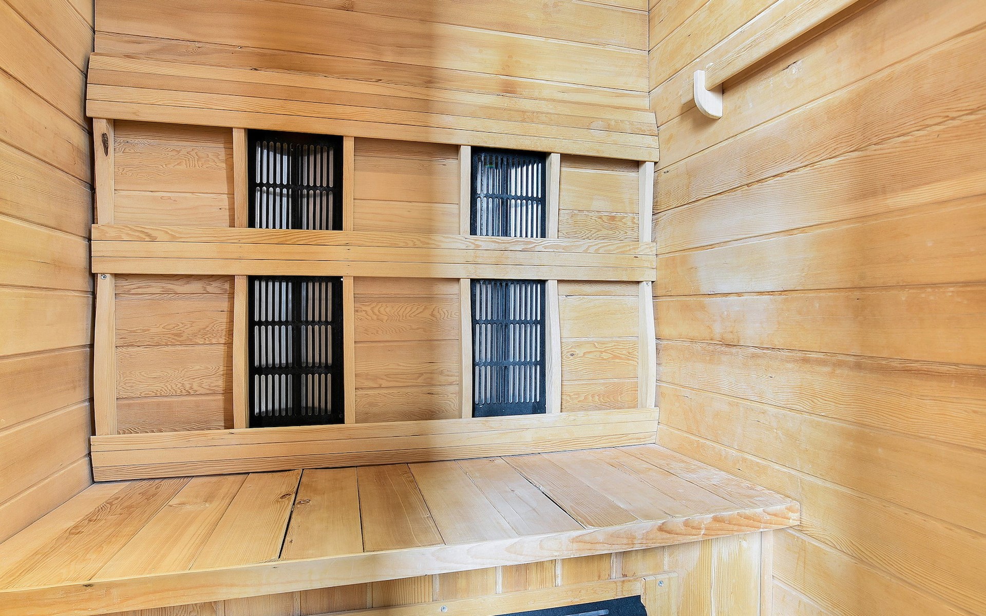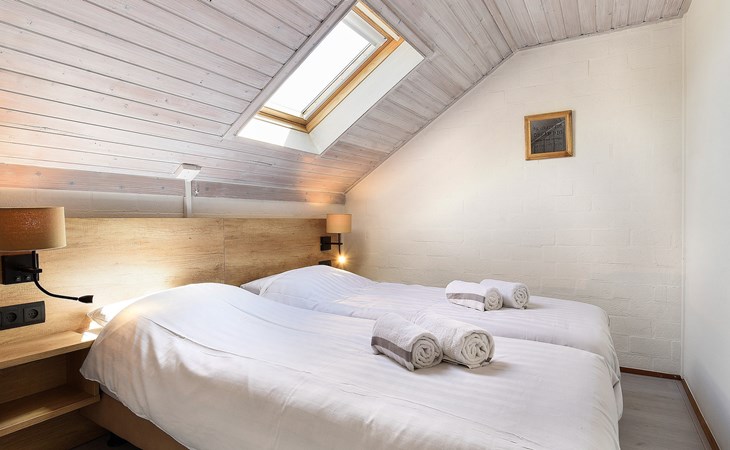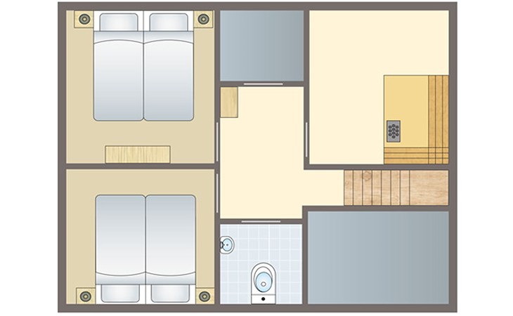 In der ersten Etage befinden sich 2 Schlafzimmer. Ein Schlafzimmer hat ein Doppelbett und das andere hat 2 Einzelbetten. Die Betten sind bei der Ankunft gemacht. Außerdem gibt es eine separate Toilette. Darüber hinaus verfügt der Bungalow über eine private Infrarotsauna für bis zu 2 Personen.