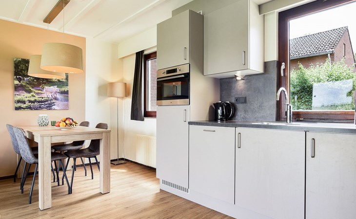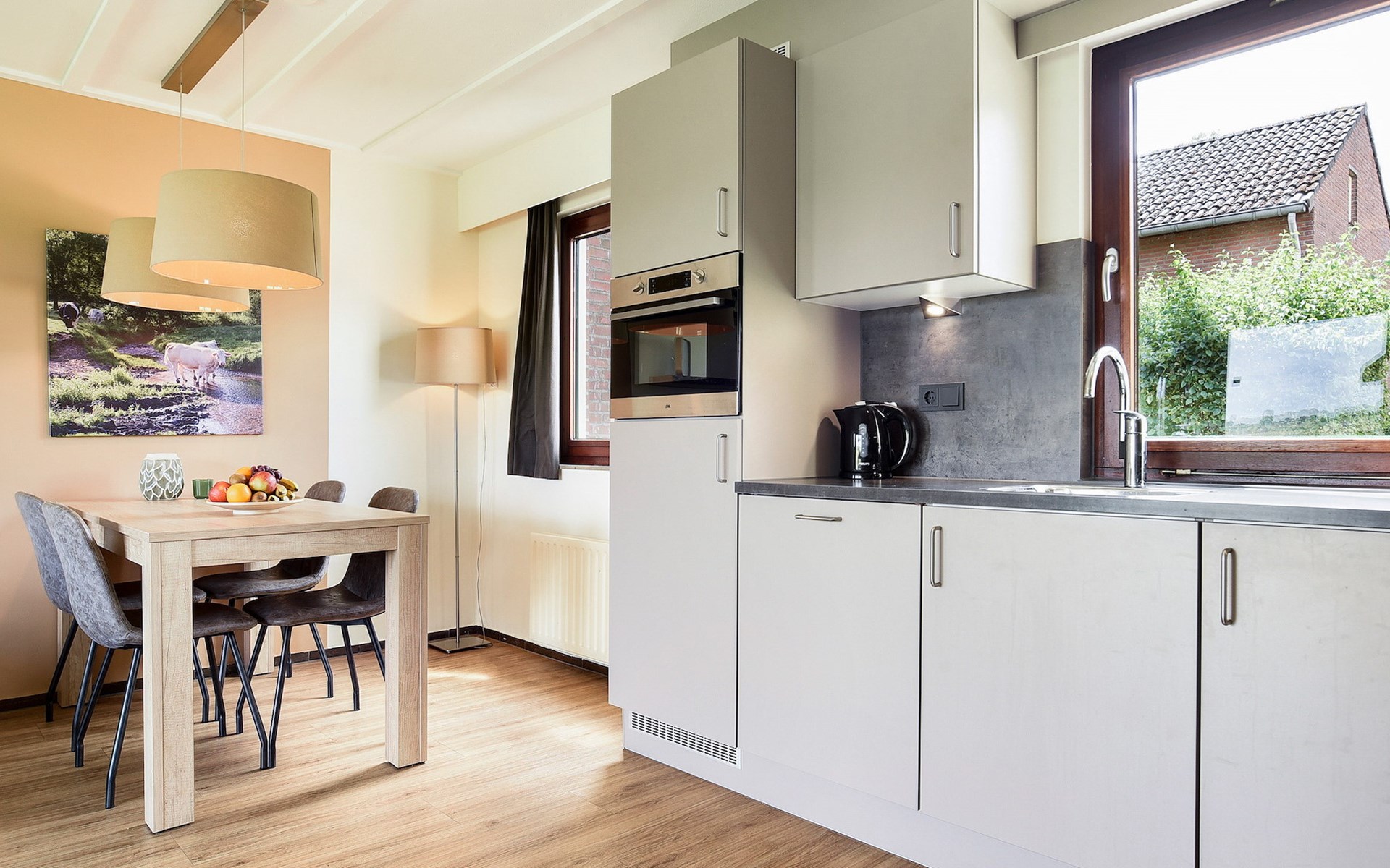 Das Wohnzimmer ist mit einer Sitzecke und einem Fernseher ausgestattet. Der Bungalow verfügt über eine offene Küche mit Essecke. Die Küche ist u.a. mit einem Kühlschrank mit Gefrierfach, einer Senseo-Kaffeemaschine, einer Kombimikrowelle und einer Geschirrspülmaschine ausgestattet.