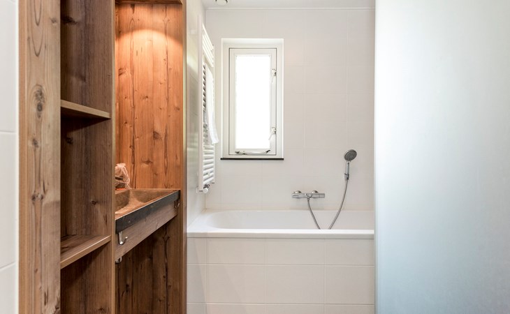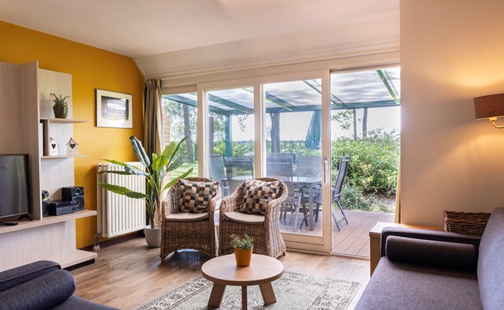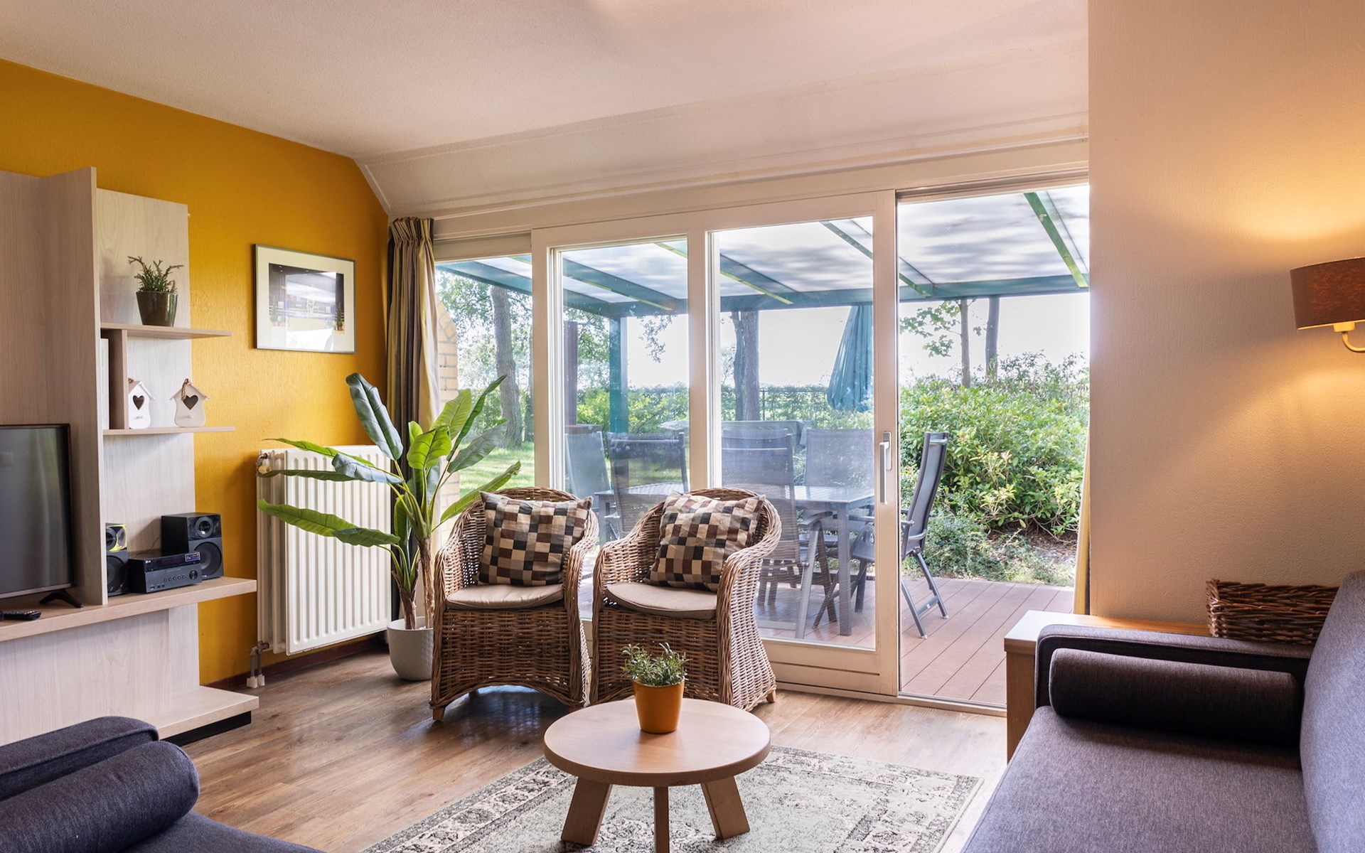 Darüber hinaus verfügt der Bungalow über eine überdachte Terrasse mit verstellbaren Gartenmöbeln, einem Loungesofa, einer Hängematte, einem Terrassenkamin, einem Sonnenschirm und einem Holzkohlegrill. Im Sommer stehen Liegestühle zur Verfügung. Der Bungalow verfügt über einen Abstellraum und ein Treppengitter.