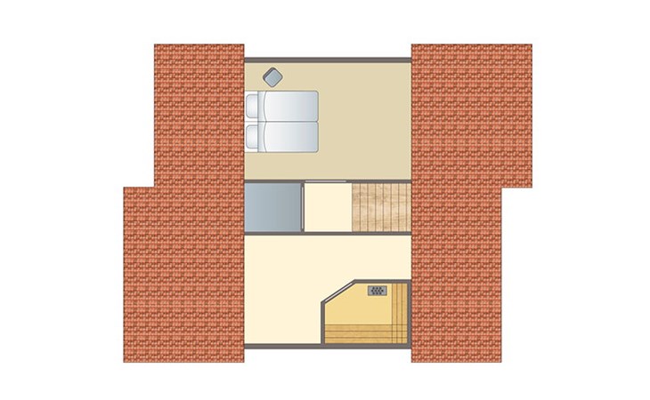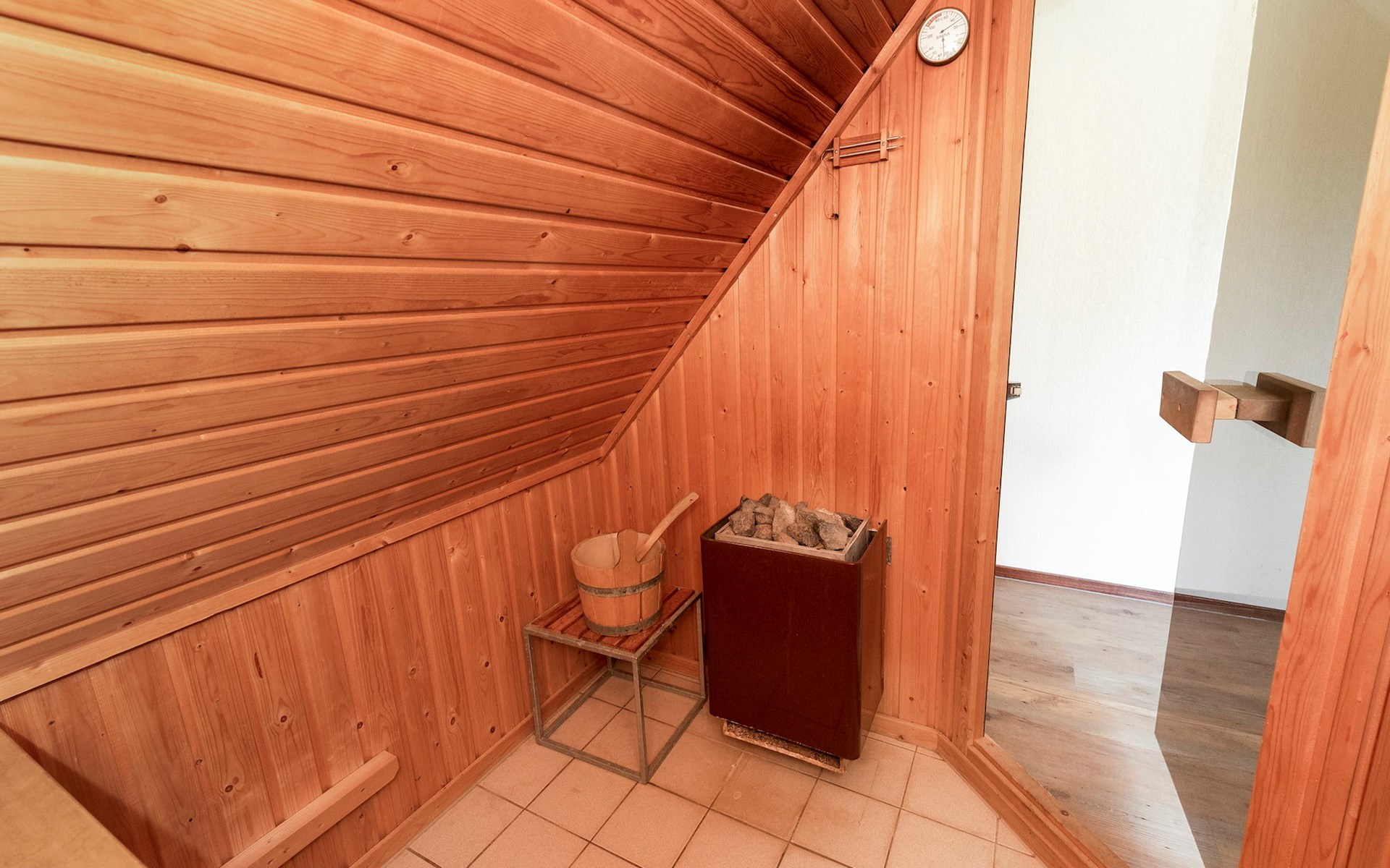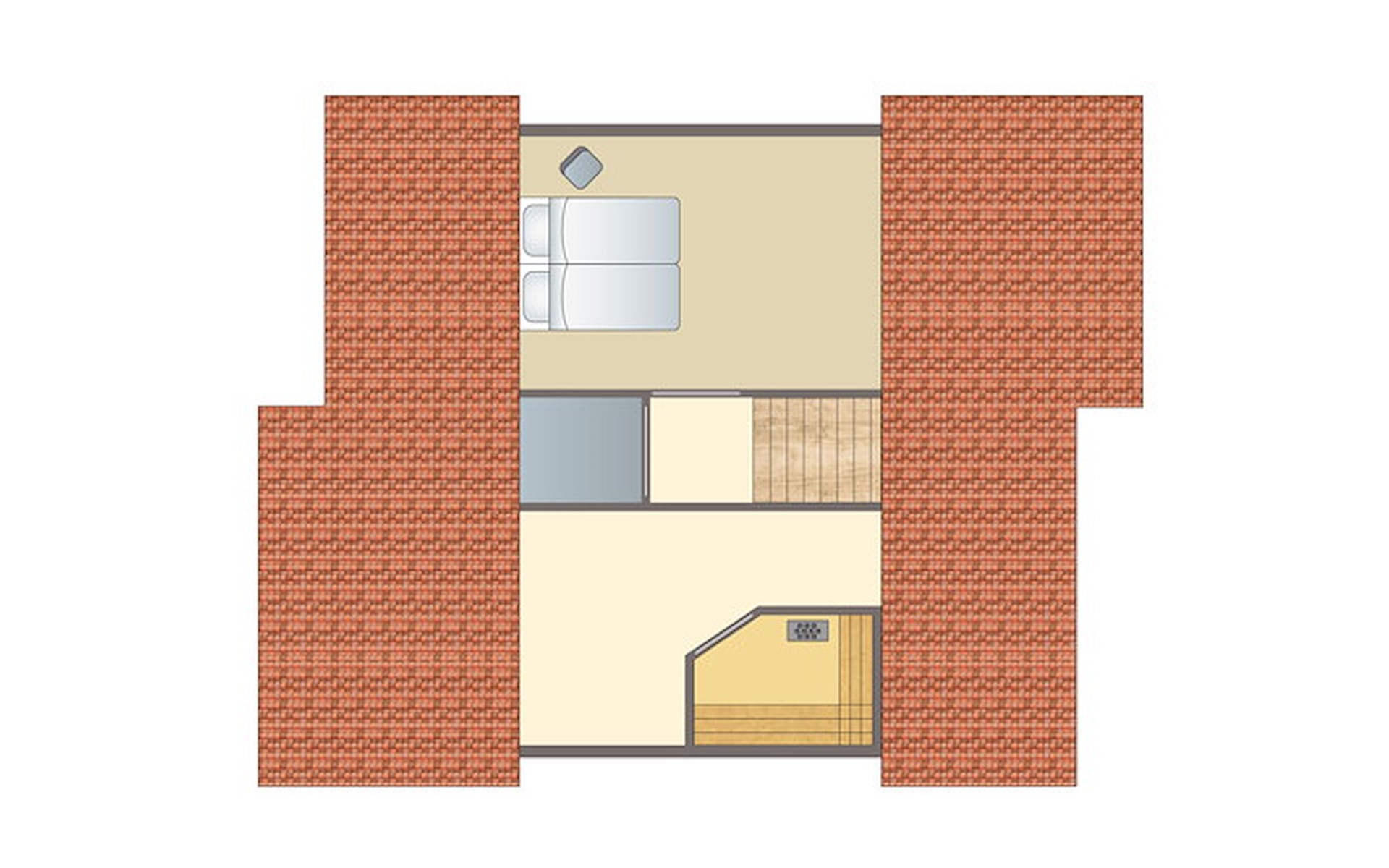 In der ersten Etage gibt es 1 Schlafzimmer mit 2 Einzel-Boxspringbetten und einem Kinderbett aus Holz. Im Bungalow gibt es auch eine private Sauna.