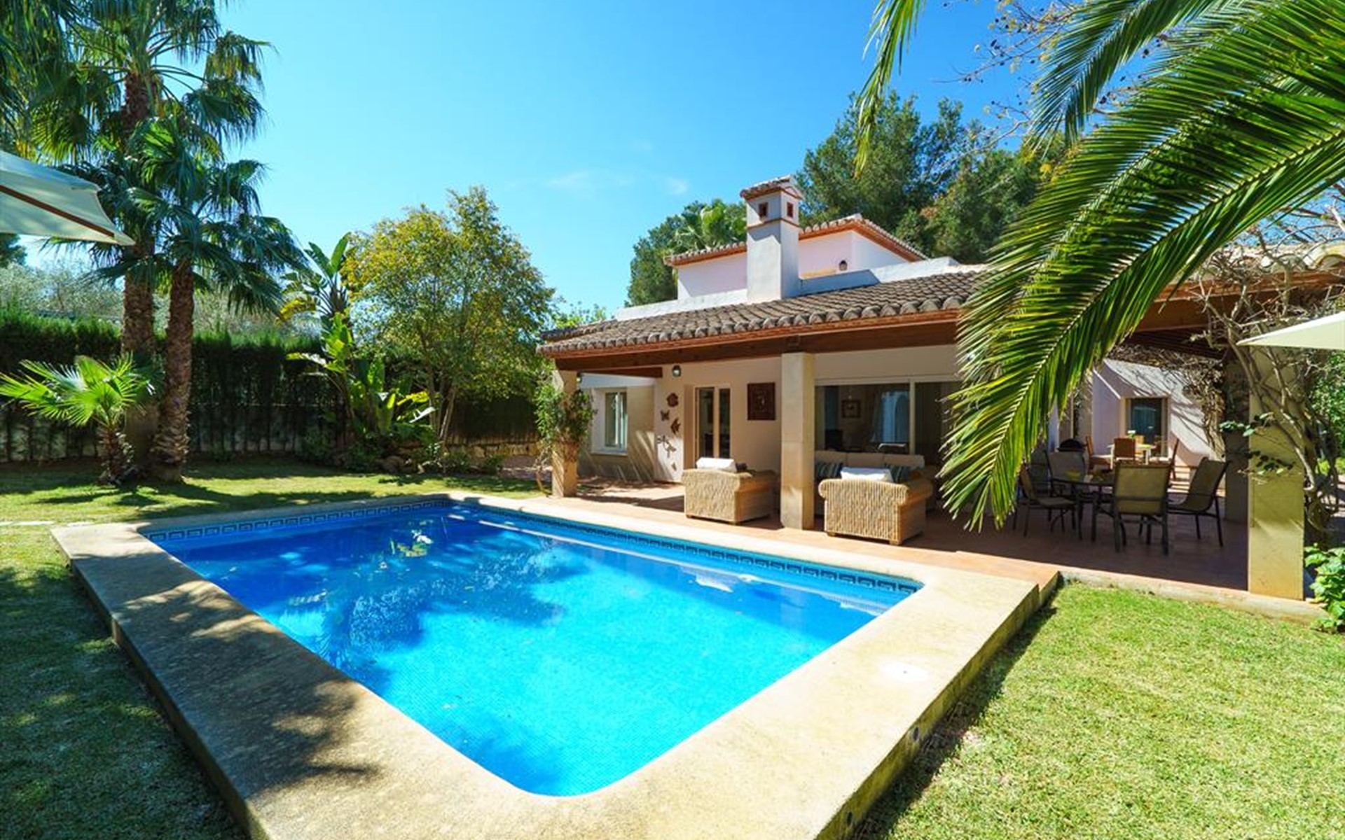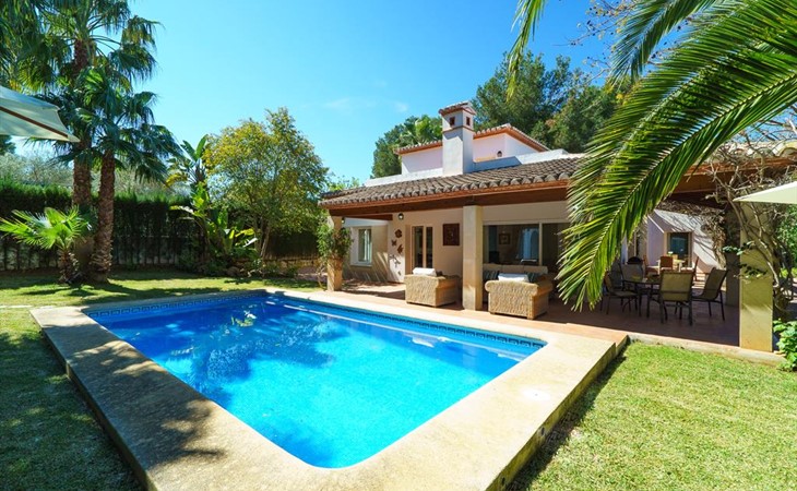 Grosse und komfortable Villa in Javea, Costa Blanca, Spanien mit privatem Pool für 4 Personen. Das Haus liegt in einer residentiellen Umgebung, etwa 1 Km entfernt vom Strand von El Arenal, Javea und etwa 1 Km entfernt von Mediterraneo, Javea.