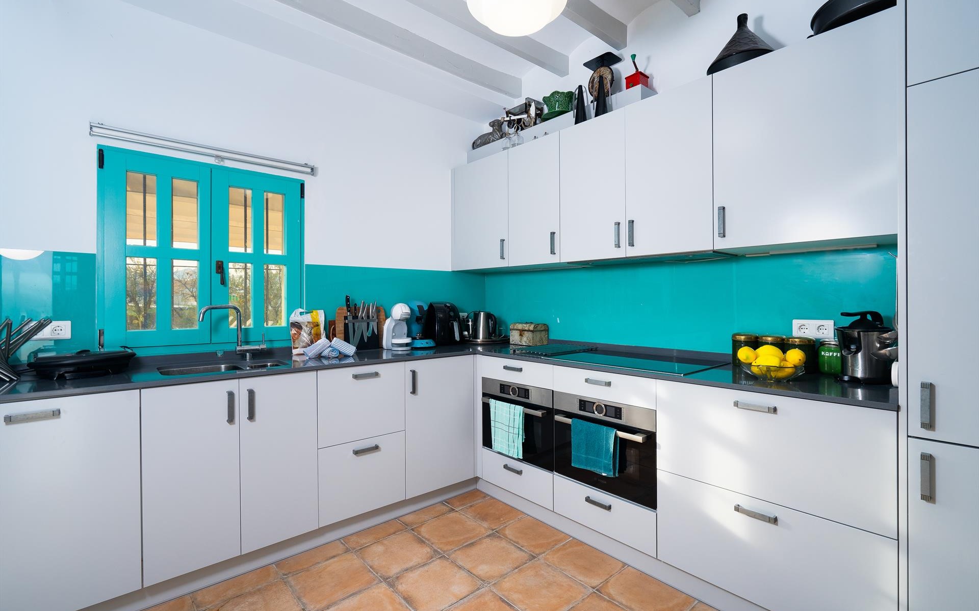 - Wohnküche mit Elektroherd, Elektroofen, Mikrowelle, Geschirrspülmaschine, Kühl-Gefrierkombination, Kaffeemaschine, Wasserkocher, Mixer, Toaster und Entsafter