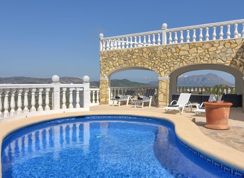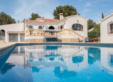Komfortables Ferienhaus mit Gemeinschaftspool in Moraira, Costa Blanca, Spanien für 6 Personen. Das Haus liegt in einer waldreichen und residentiellen Küsten-Umgebung und etwa 3 Km entfernt vom Strand.