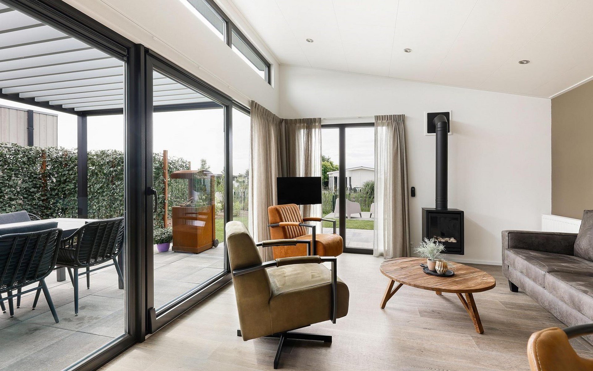 Das Wohnzimmer ist auf moderne und angenehme Weise mit einem Kamin, wundervollen Stühlen und einem Sofa eingerichtet. Die Wellnessvillas haben eine Klimaanlage und eine Schiebetür, die auf die Terrasse führt.