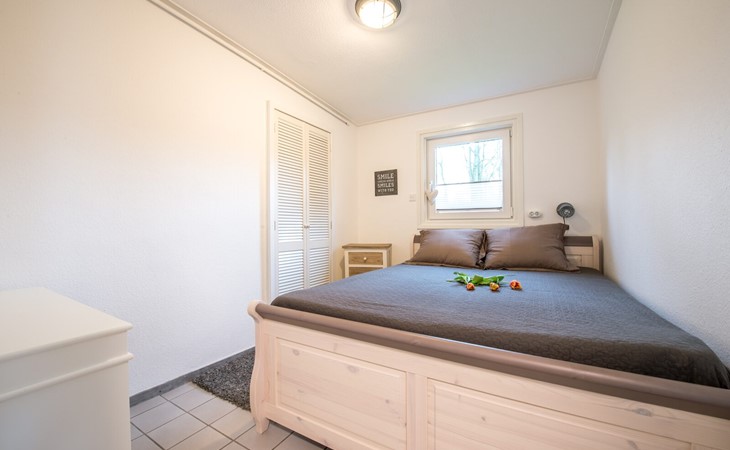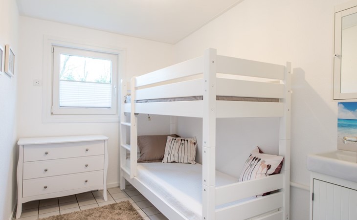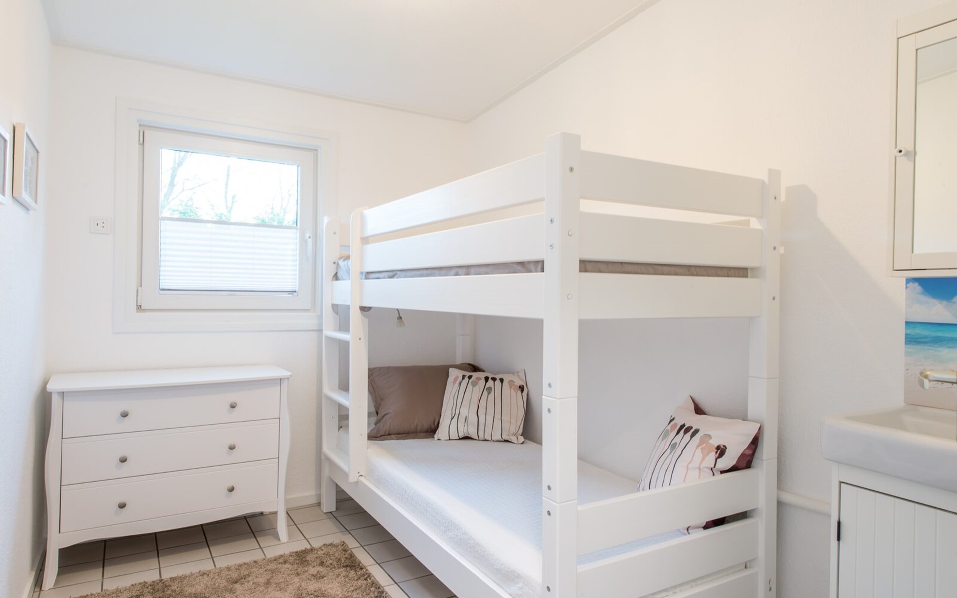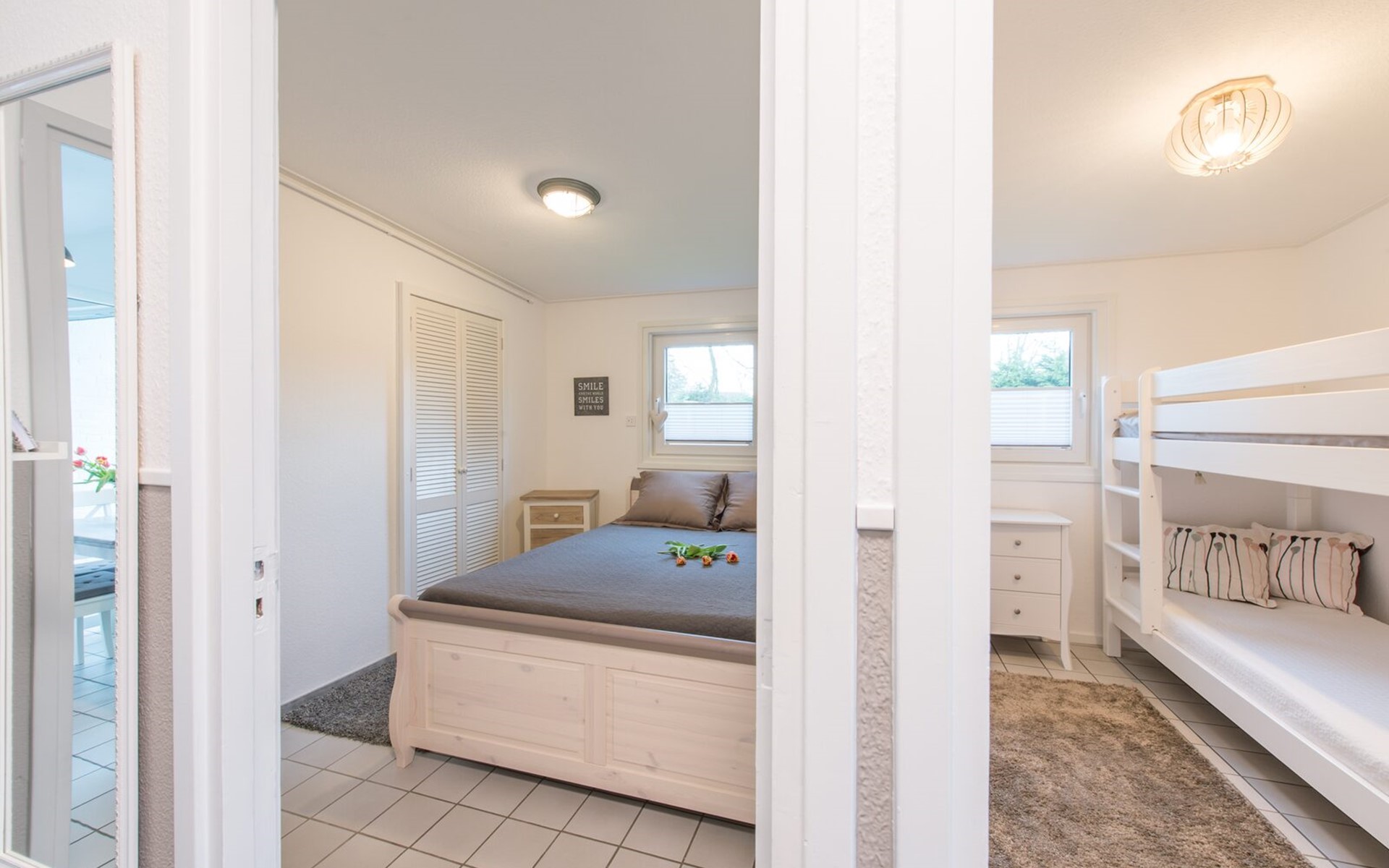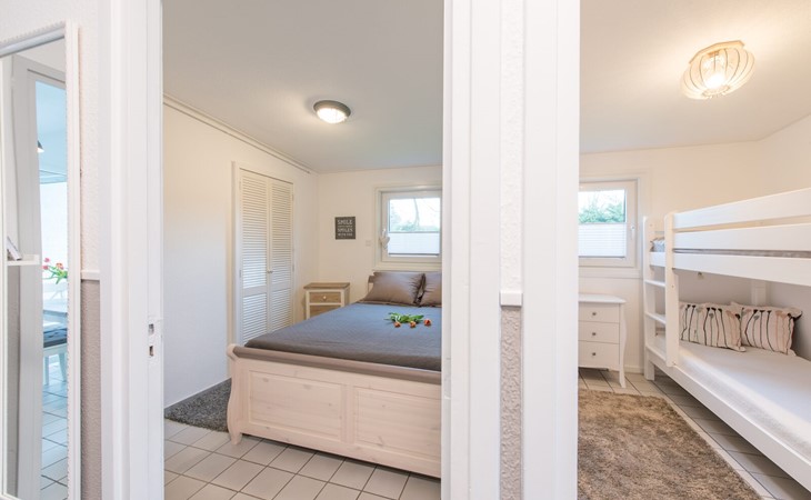Es gibt zwei Schlafzimmer, Eines mit einem Doppelbett ( 1.60 M) und eines mit Etagenbett.