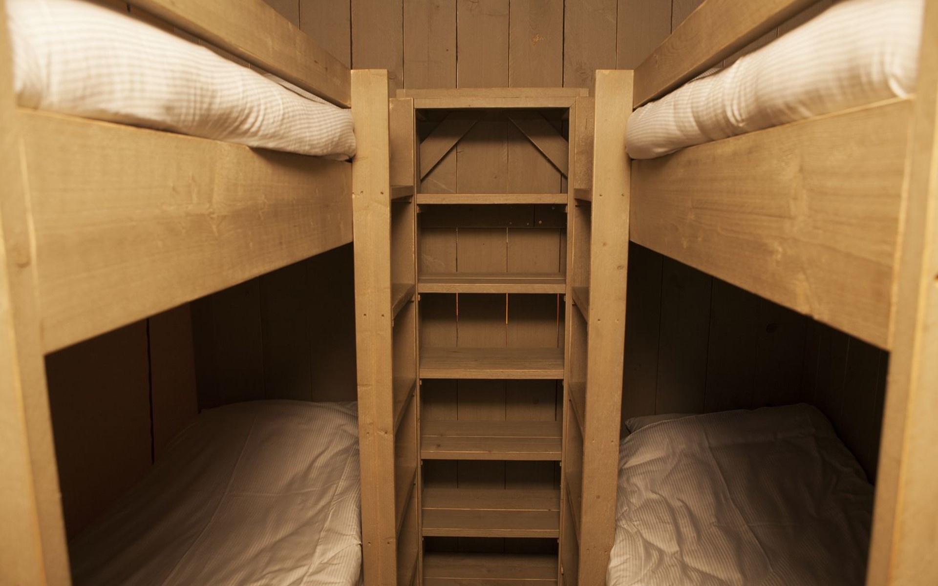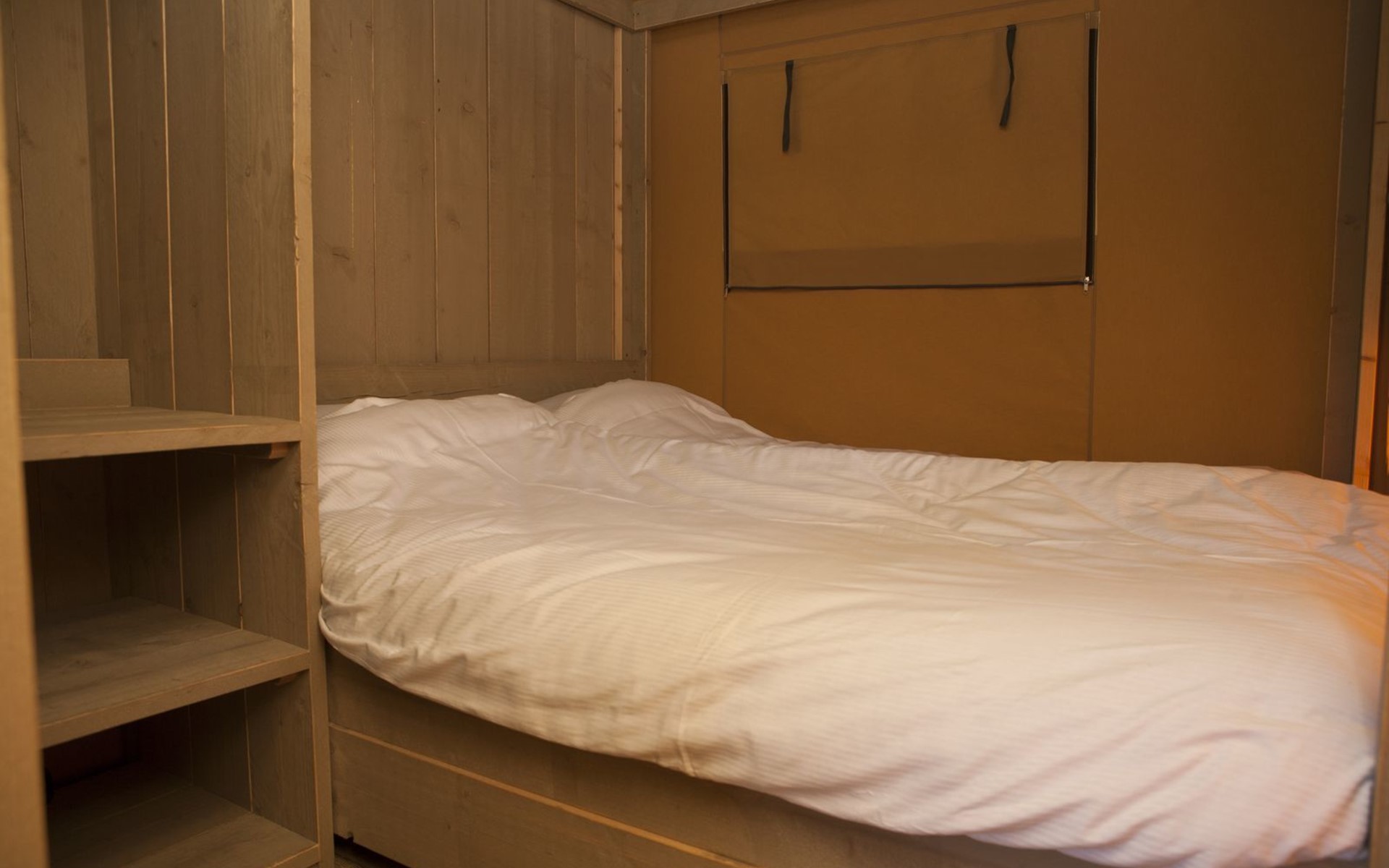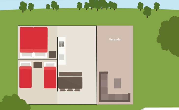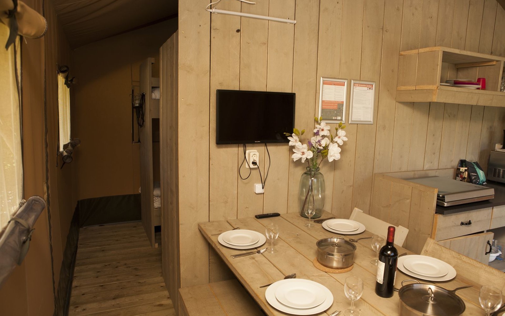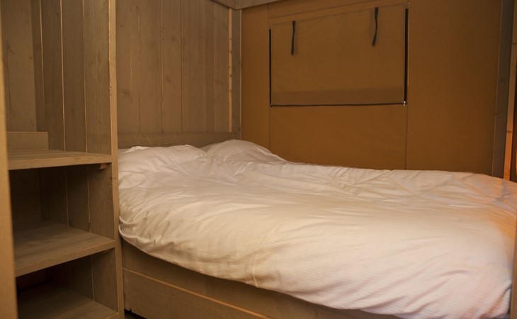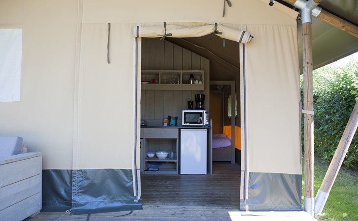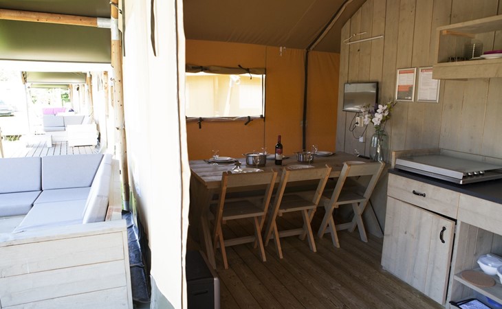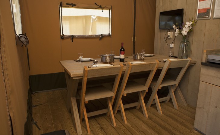 Das robuste Safarizelt bietet Ihnen eine luxuriöse Form des Campings. Das Zelt ist komplett ausgestattet, einschließlich einer Küche mit 4-Flammen-Gasherd, Kombi-Mikrowelle, Senseo-Kaffeemaschine und Kühl-Gefrierkombination, einem geräumigen Esstisch, einem Fernseher, einem Schlafzimmer mit zwei Einzelbetten und einem Schlafzimmer mit zwei Etagenbetten. Das Safarizelt ist für 6 Personen geeignet und hat dank der Zeltoptik und der Holzmöbel einen robusten Look.