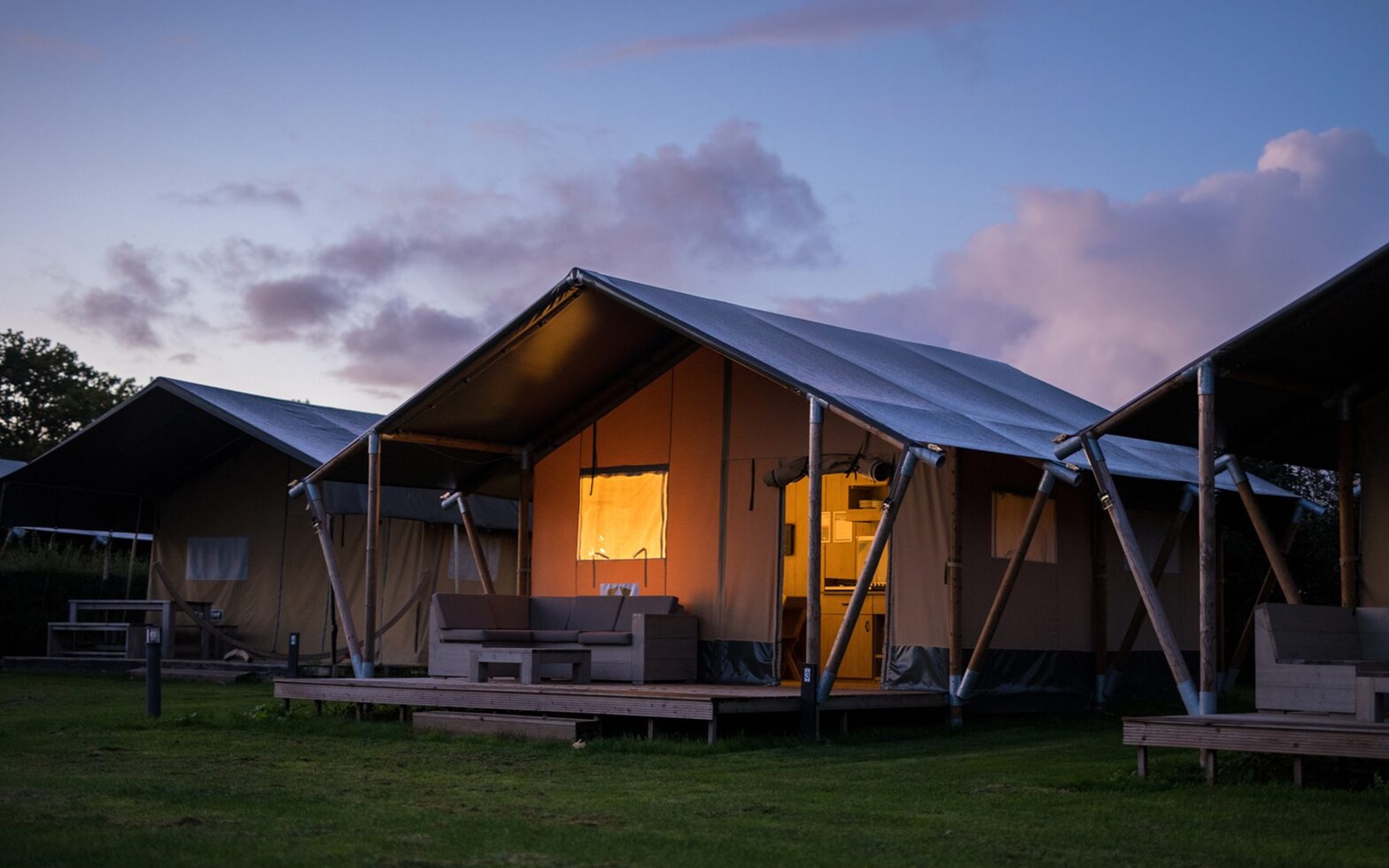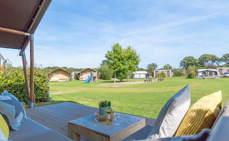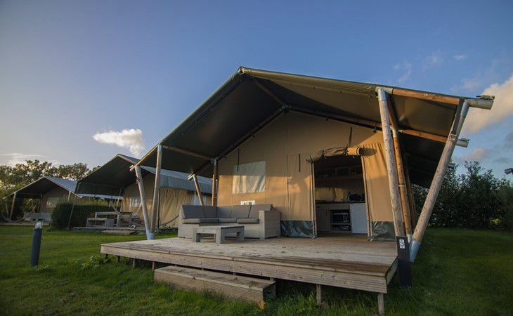 Zum ultimativen Glamping-Erlebnis gehören private Sanitäranlagen. Deshalb finden Sie neben dem Zelt eine private Sanitäreinheit mit Toilette, Waschbecken und Dusche. Die geräumigen Safarizelte befinden sich auf dem autofreien Campingteil des Parks. Genießen Sie die Sonne und die Aussicht von der Veranda mit Gerüstholzmöbeln.