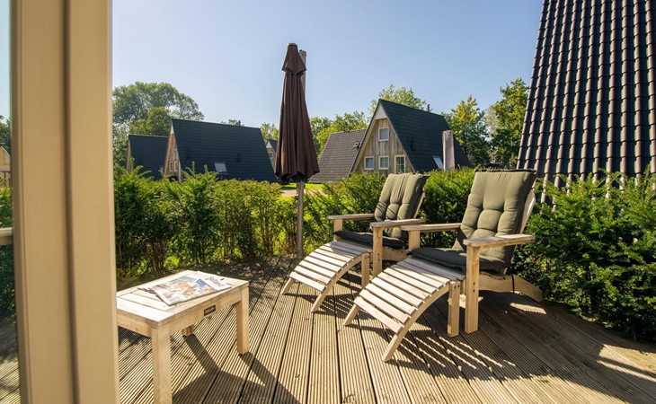 The Wellness Lodge consists of a ground floor and a sleeping loft with a premium double bed. The entrance and a separate toilet are on the ground floor. The spacious living room has a flat screen TV, gas-fired stove, and floor heating. It also has the double doors to your own terrace with luxurious teak lounge chairs and a parasol. The luxury open kitchen has a gas hob, dishwasher, microwave oven, Illy espresso machine, and a fridge freezer. The luxury wellness bathroom is on the ground floor as well and includes a rain shower with Sunshower, a whirlpool, a traditional sauna, and a basin. Of course, the lodge is provided with free wifi.Pets are only allowed on request. In addition, the Wellness Lodge is strictly non-smoking and does not provide parking. It is possible to place a cot.