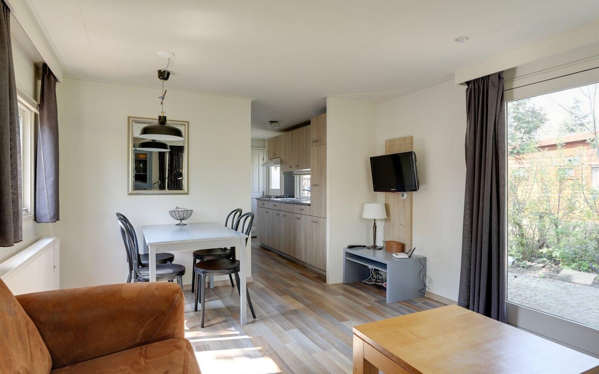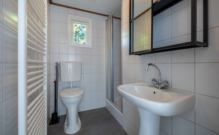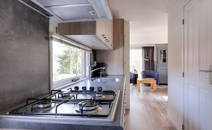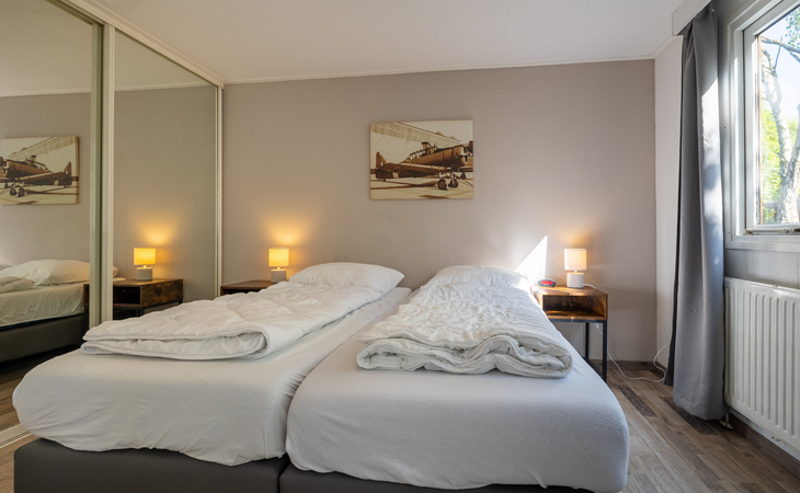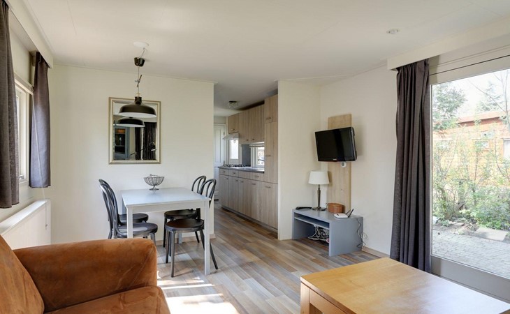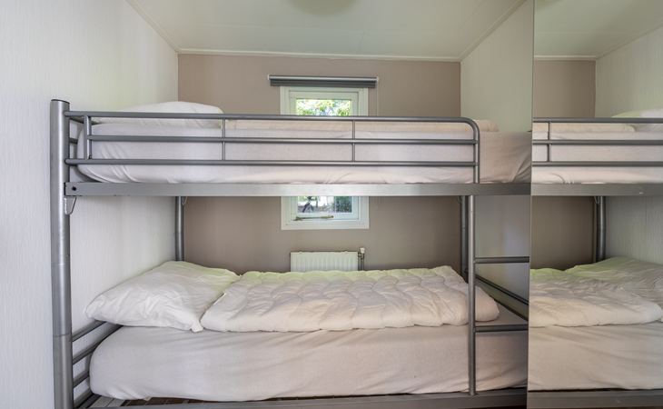 The chalet has a living room, where you can watch a movie on the flat-screen TV, play a (family) game in the dining area, or just relax and read book on the couch. The chalet has a fully equipped kitchenette, with a fridge-freezer, coffee machine and kettle, 4-burner cooker, and a microwave. The bathroom has a shower, a sink, and a toilet. There are two bedrooms, one with a double bed and the other with a bunk bed, available. The beds have single duvets and pillows.