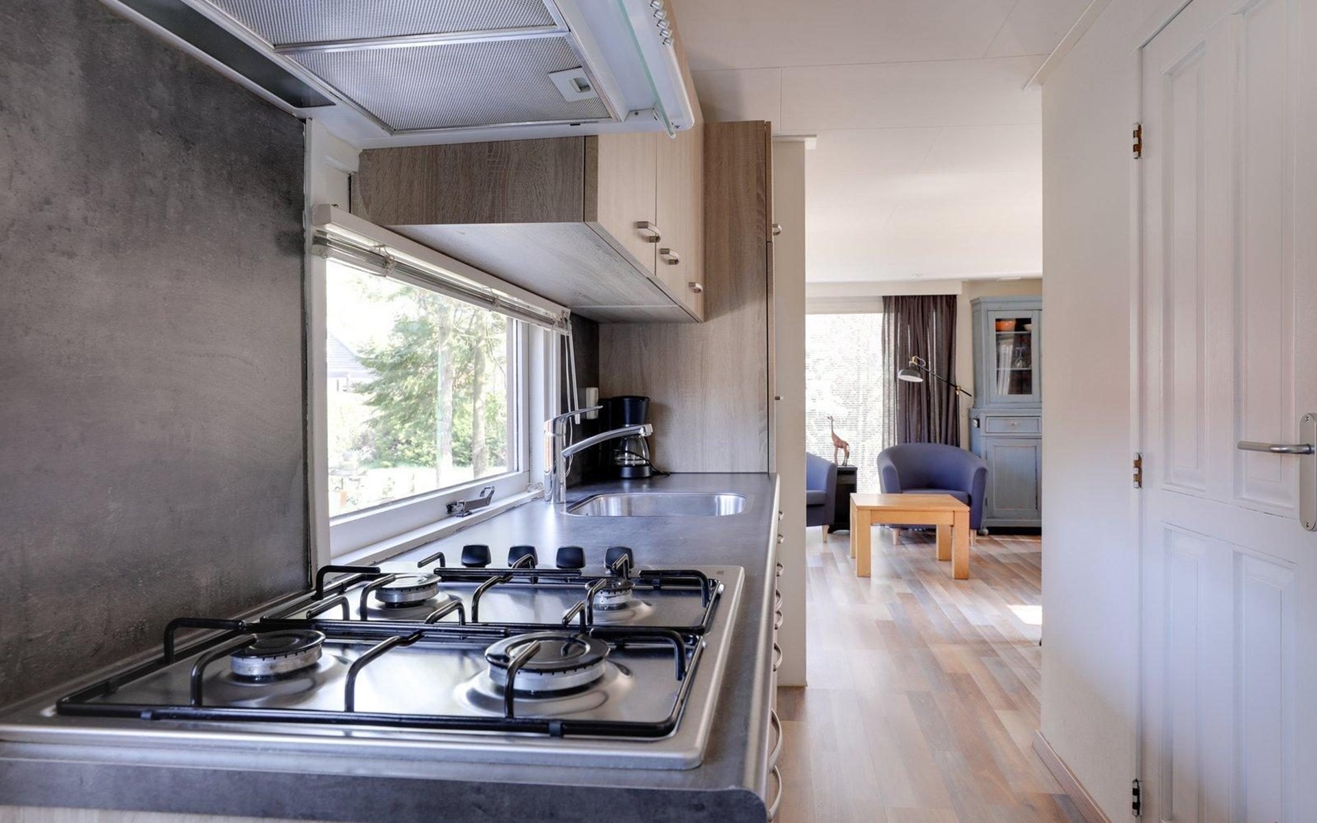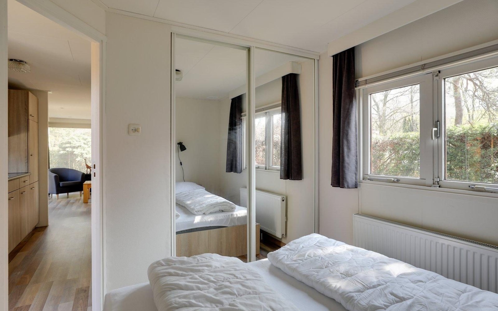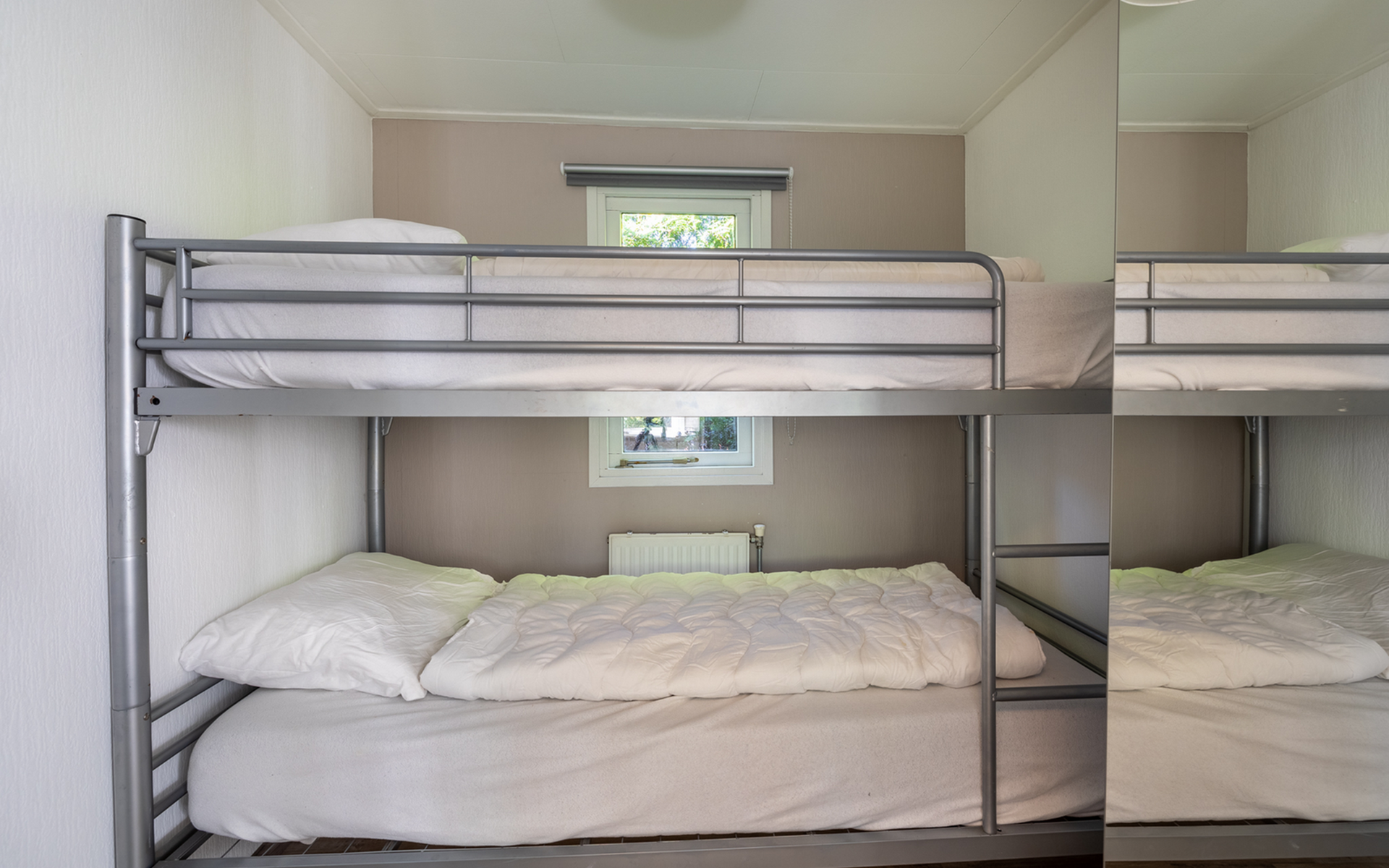 The chalet has a living room, where you can watch a movie on the flat-screen TV, play a (family) game in the dining area, or just relax and read book on the couch. The chalet has a fully equipped kitchenette, with a fridge-freezer, coffee machine and kettle, 4-burner cooker, and a microwave. The bathroom has a shower, a sink, and a toilet. There are two bedrooms, one with a double bed and the other with a bunk bed, available. The beds have single duvets and pillows.