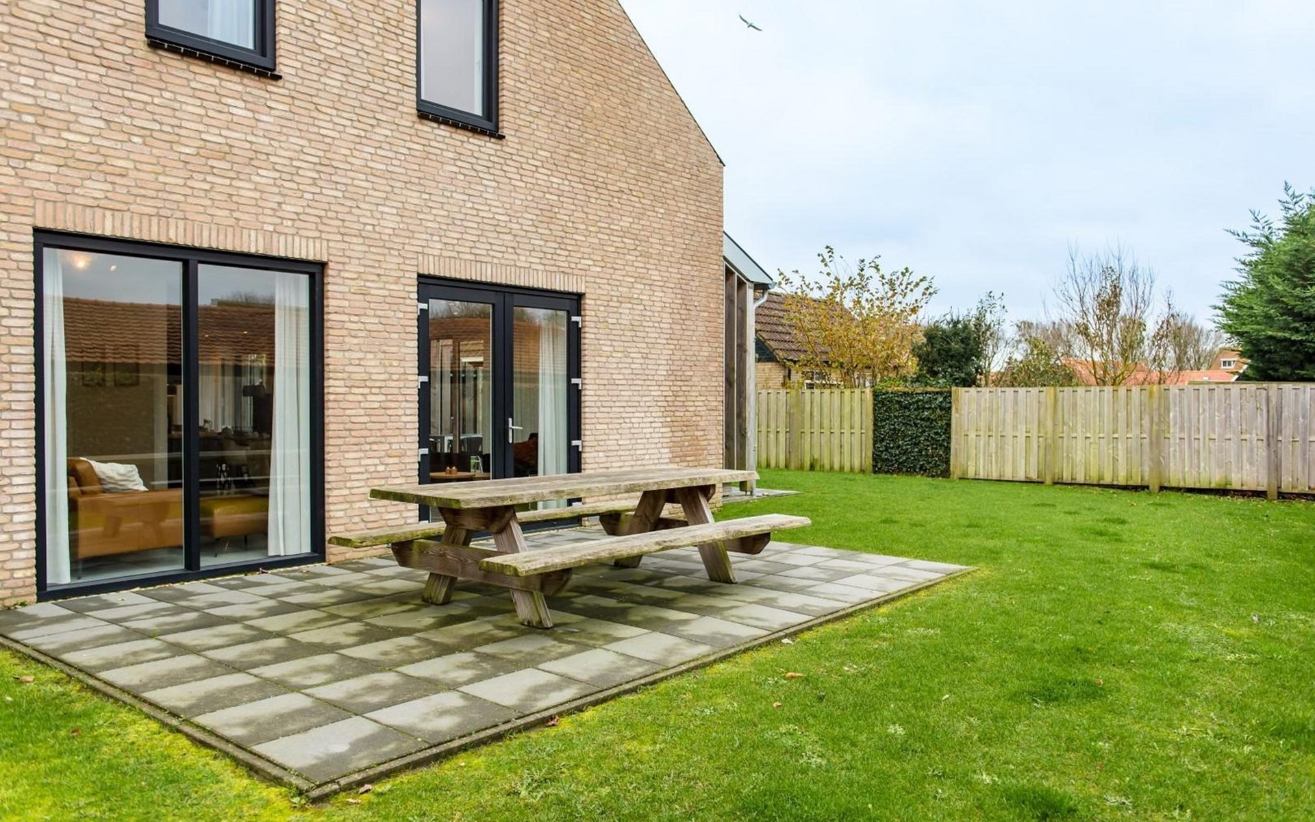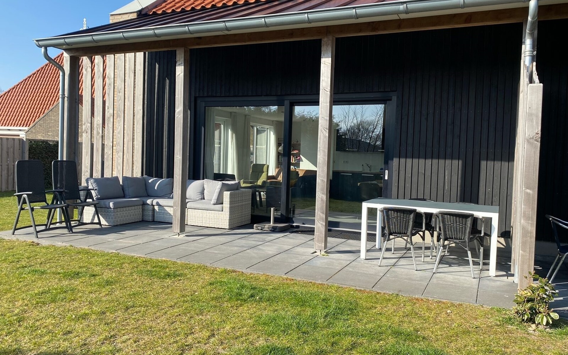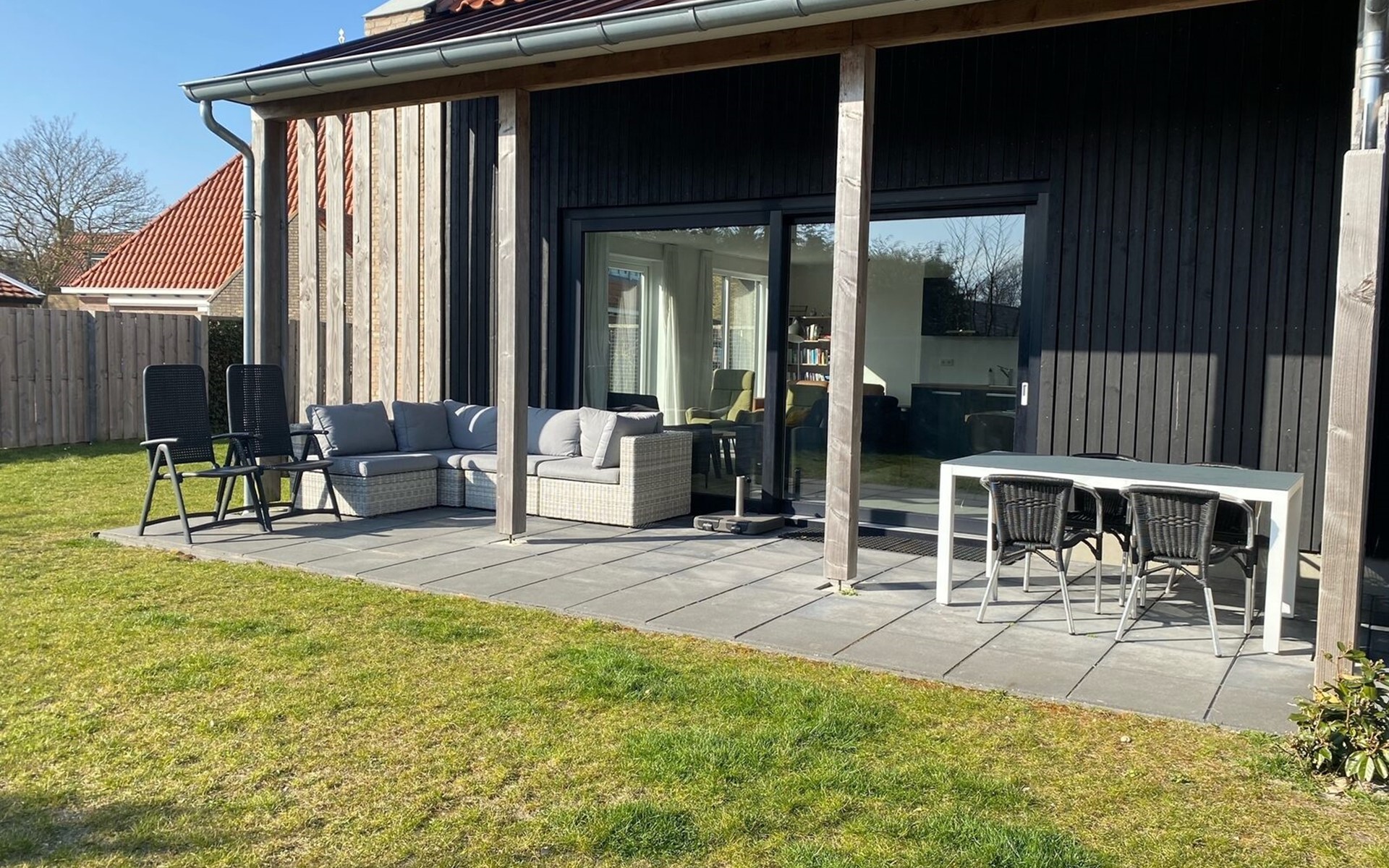 Through the living room there are doors to the spacious terrace with patio furniture and the large garden.