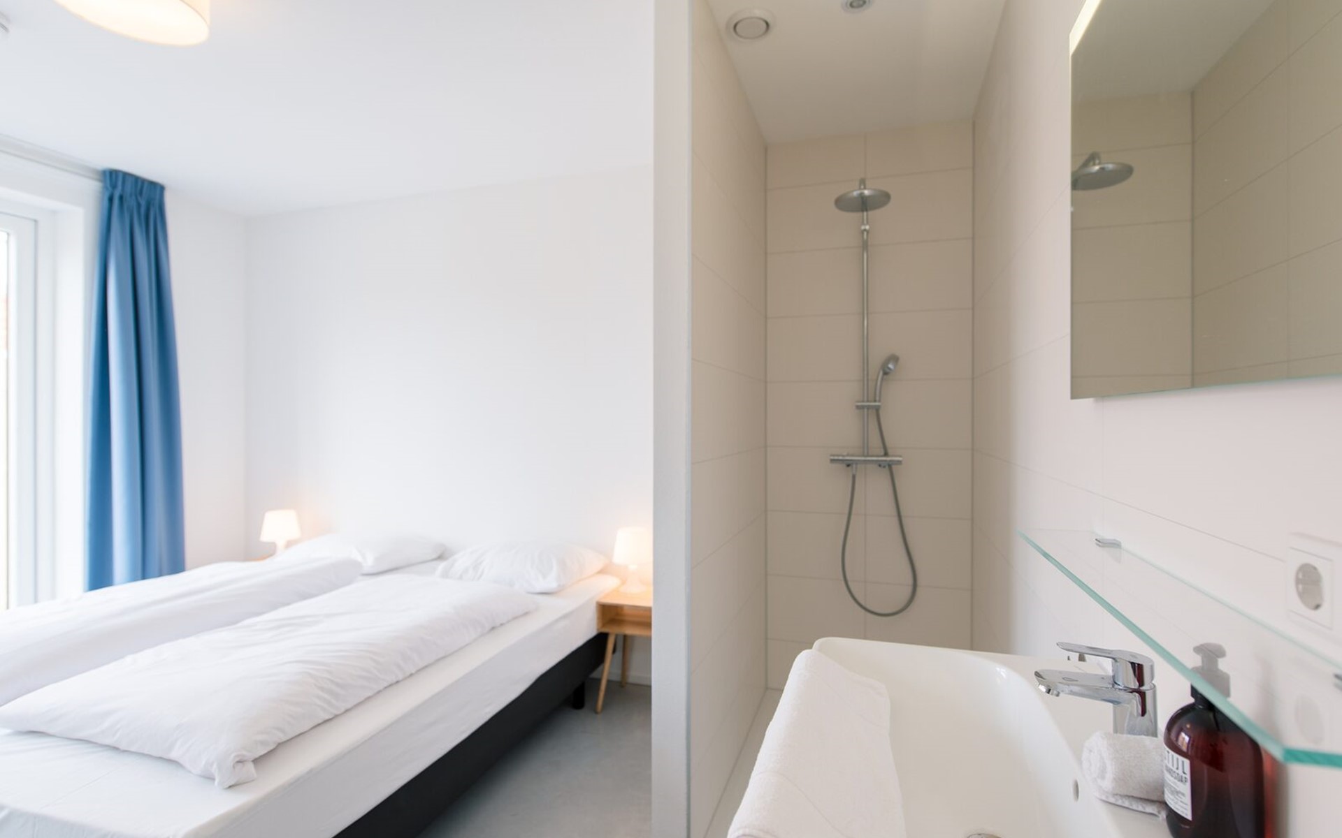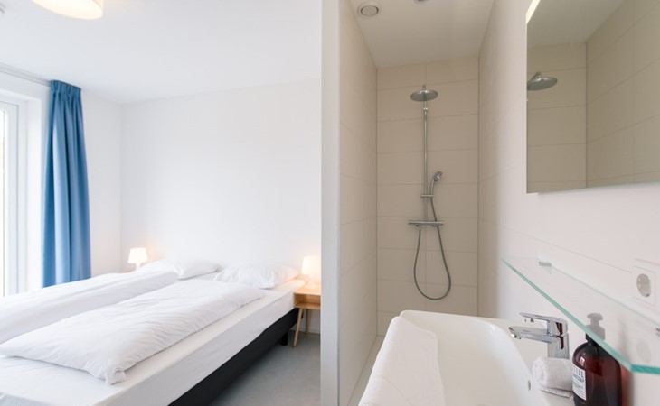 - 1x bedroom on the 1st floor with box-spring beds, ensuite shower and sink.
