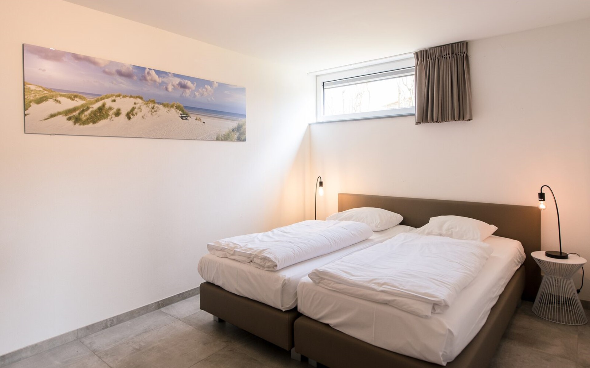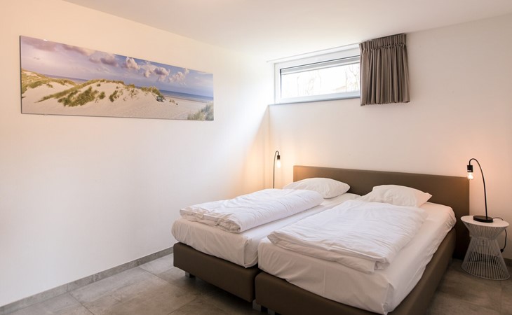 Klavervier is a split level house with a fresh interior. On the ground floor is the utility room and living room and the stairwell has a small staircase leading up to two bedrooms and a bathroom and the same goes for the small staircase downstairs. The layout is therefore ideal with, for example, 2 families (each floor has a bathroom and 2 bedrooms, one room with a double bed and a room with 2 single beds).