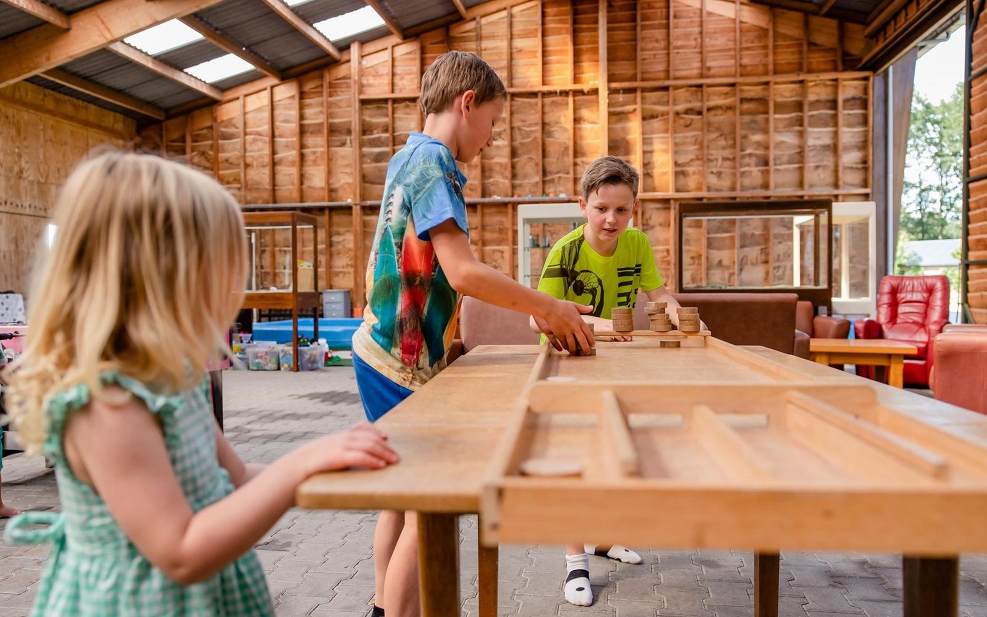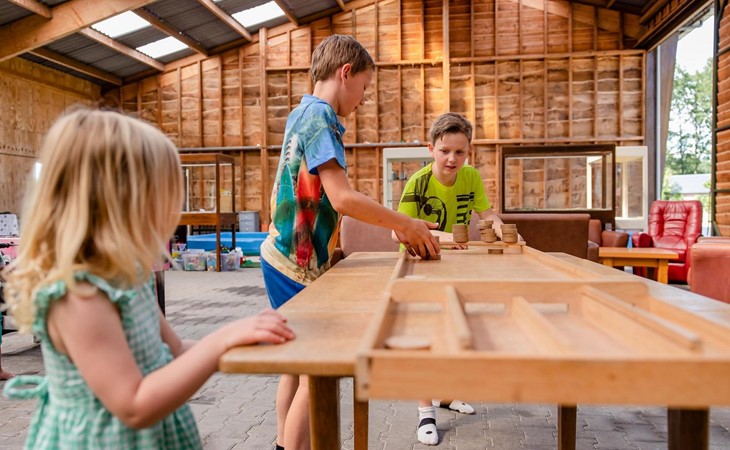 Originele inrichting van het terrein, speelschuur, zichtbare aanwezigheid en vriendelijkheid van het personeel, autoluw, schoon, Fien en Teun