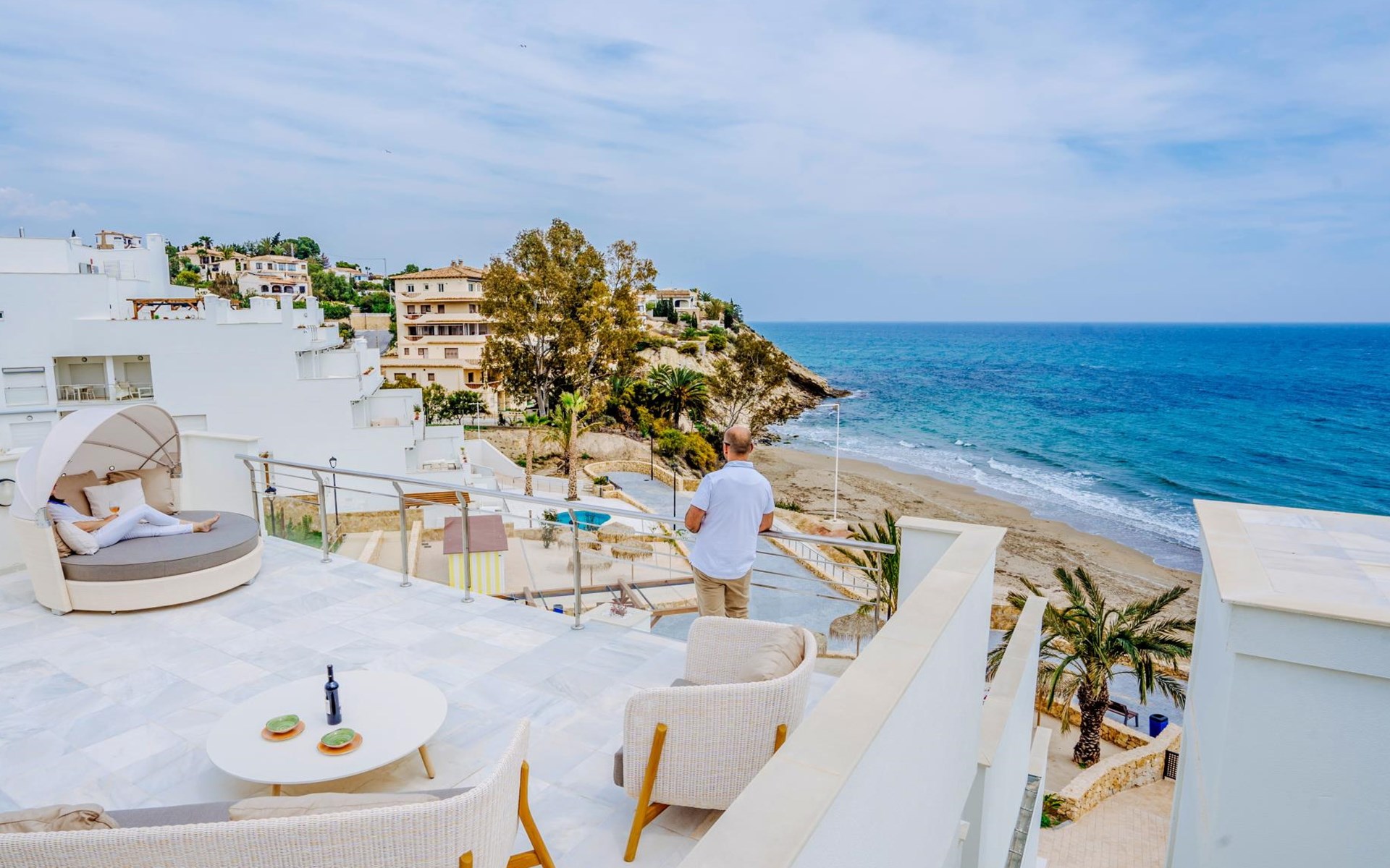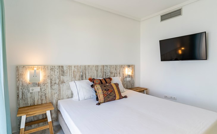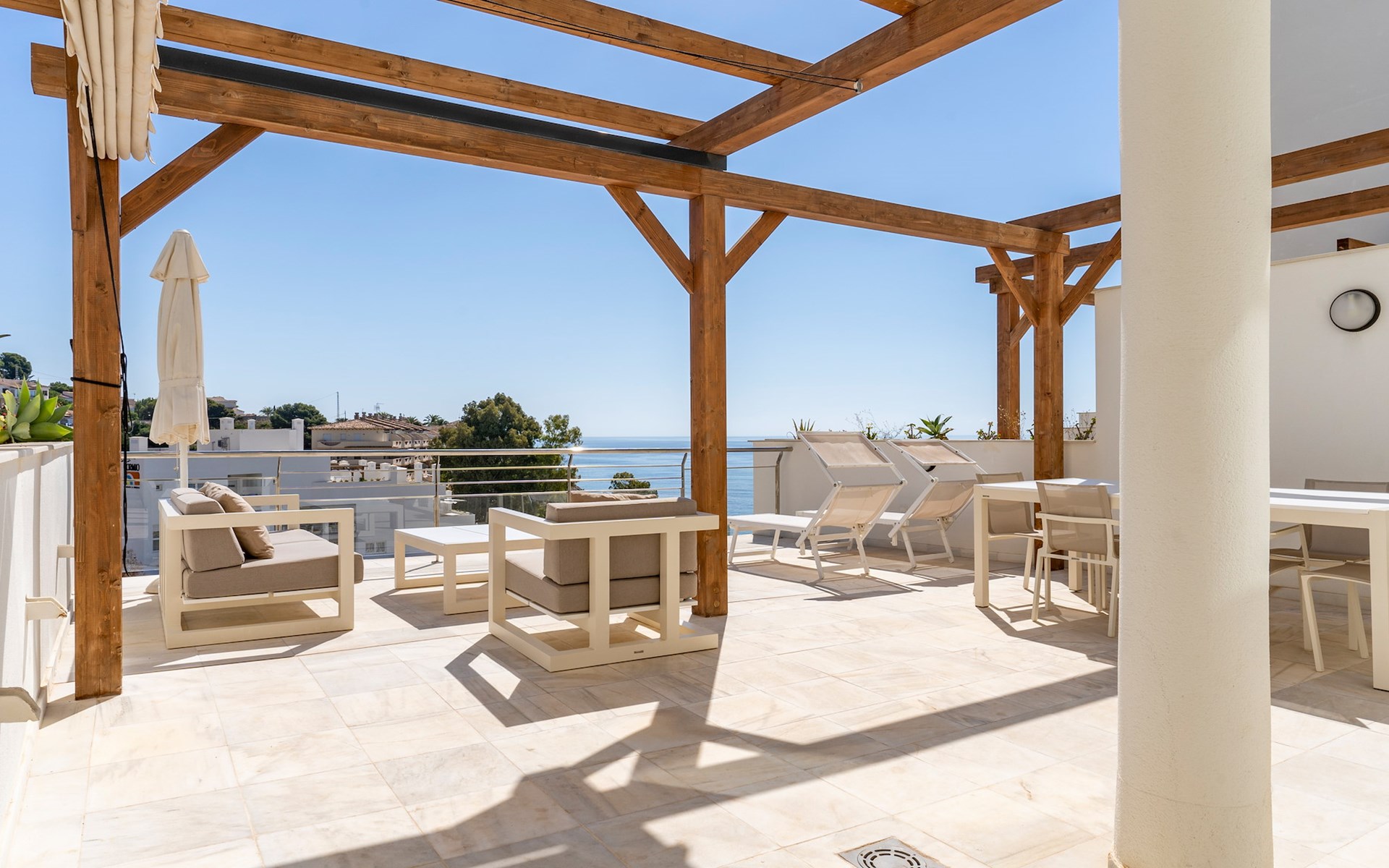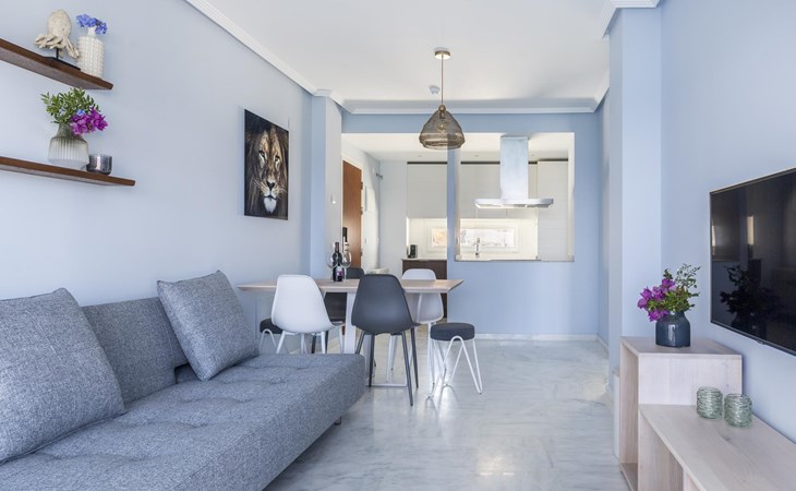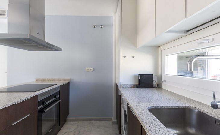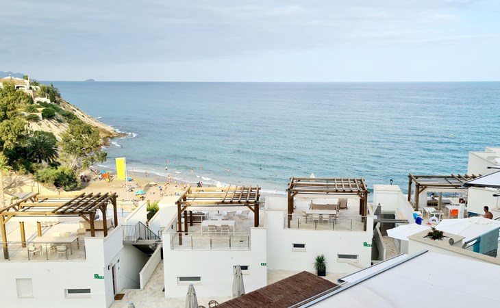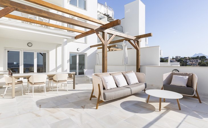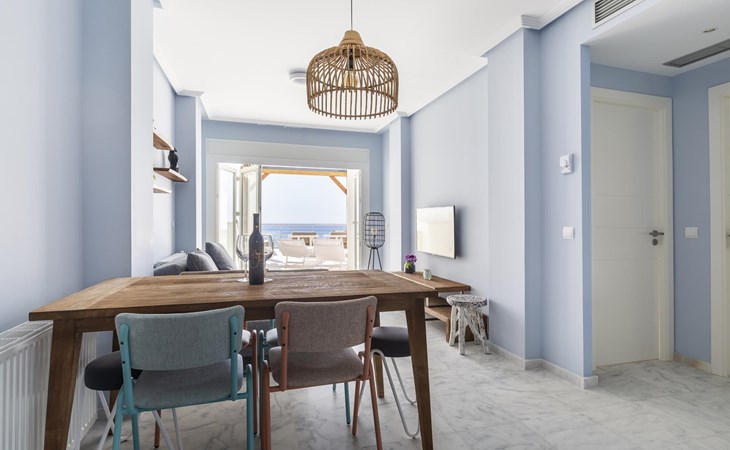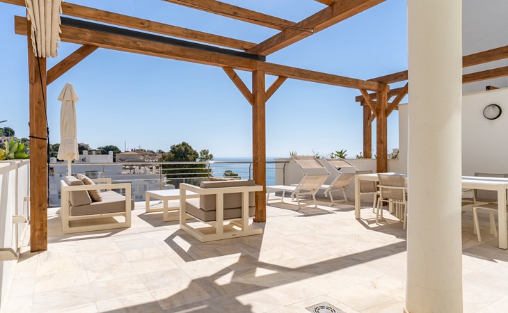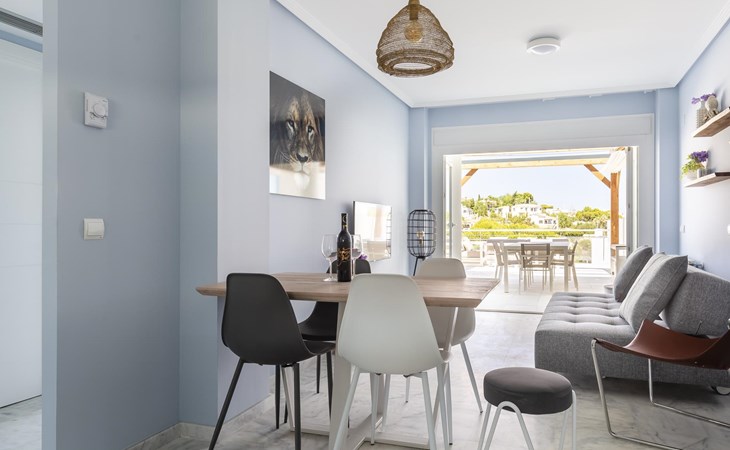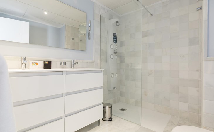 The apartment has two bedrooms, each with two single beds. The bedroom has an ensuite luxury bathroom, with a shower, toilet, bidet and washbasin. What is special about this apartment is that you have almost as much space outside on the terrace as inside. This is of course ideal for an apartment on the Costa Blanca! There are sea views from your terrace.