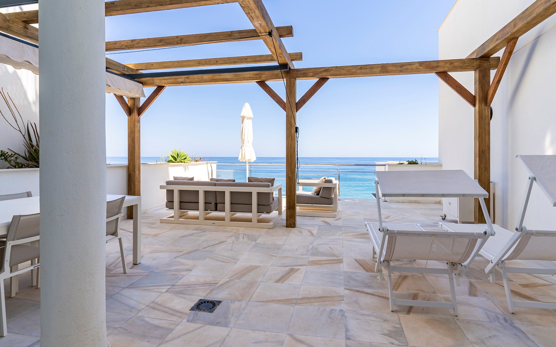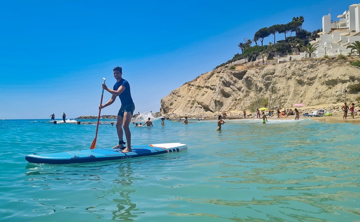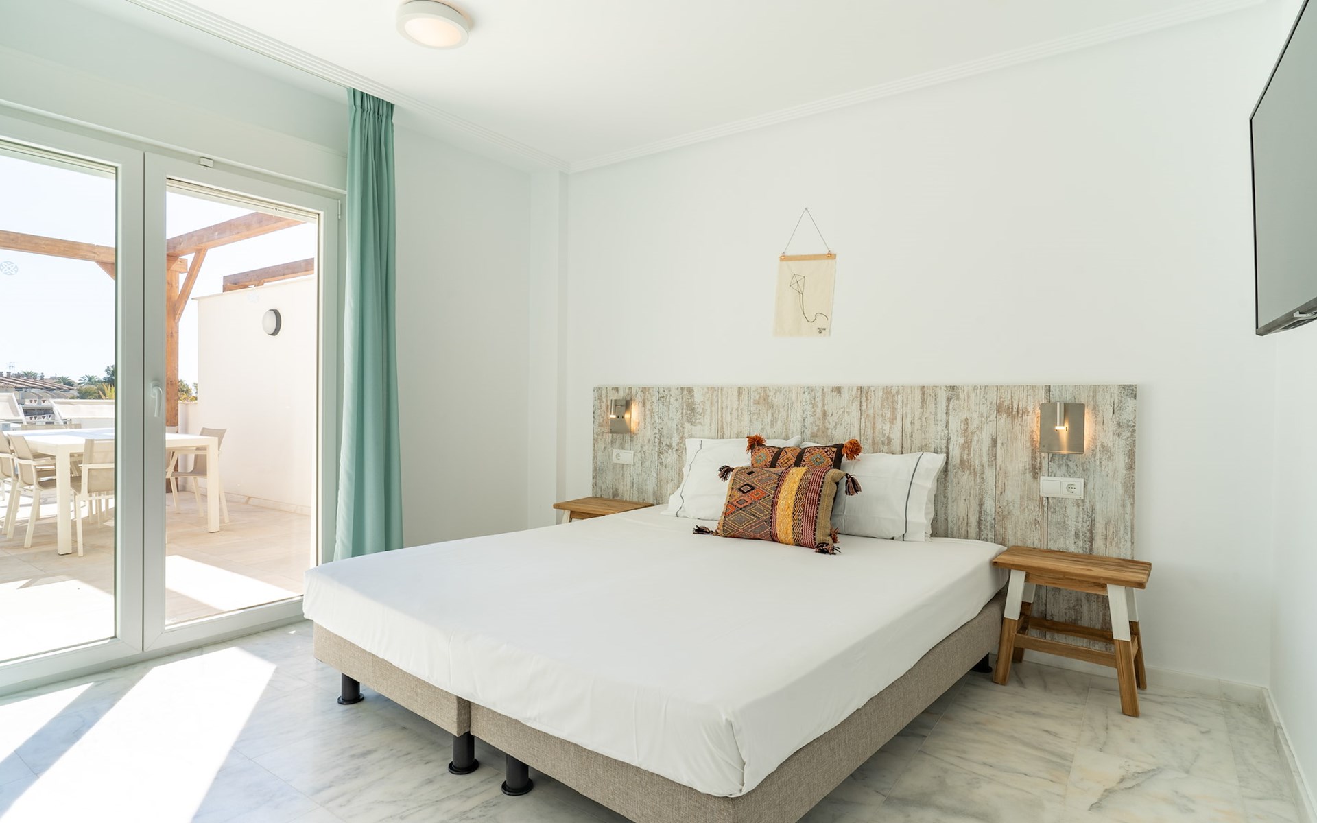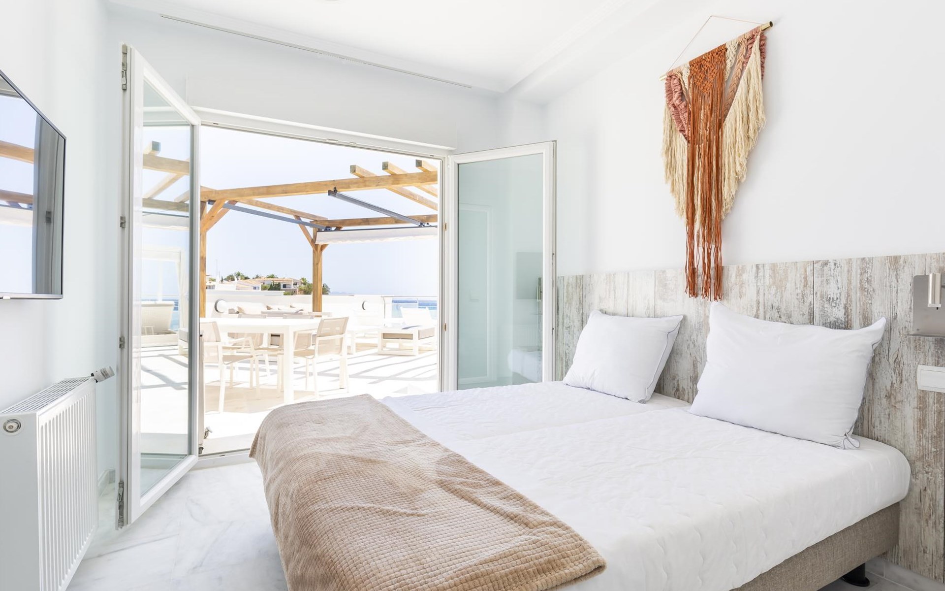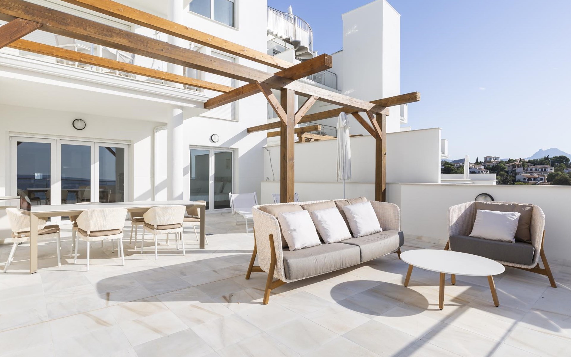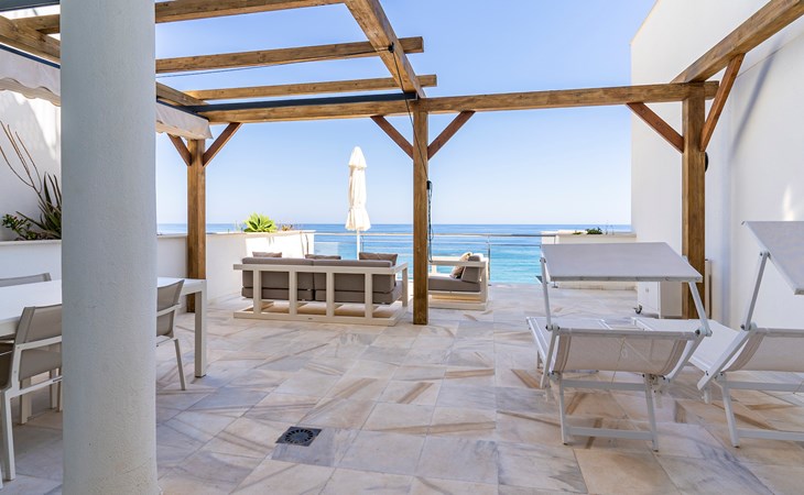 The apartment has two bedrooms, each with two single beds. The bedroom has an ensuite luxury bathroom, with a shower, toilet, bidet and washbasin. What is special about this apartment is that you have almost as much space outside on the terrace as inside. This is of course ideal for an apartment on the Costa Blanca! There are sea views from your terrace.