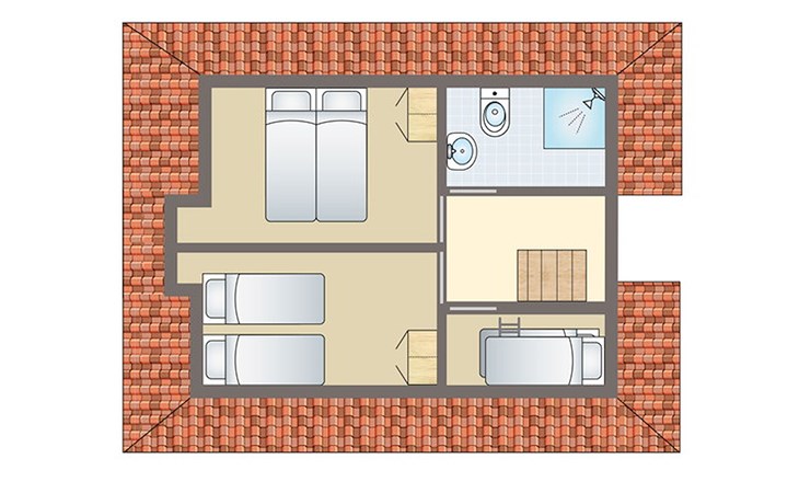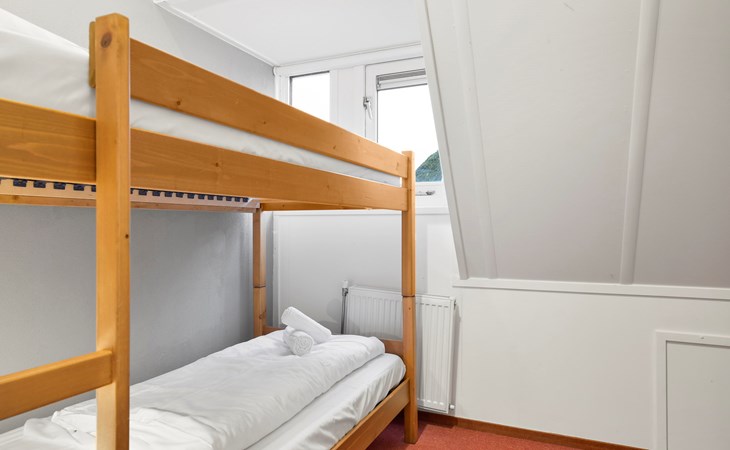 On the first floor there are three bedrooms and the bathroom. In one bedroom there are two single box spring beds with a soft topper. The other bedroom has two single box spring beds. The third bedroom has a bunk bed. The bathroom has a shower cubicle, washbasin, and toilet. The bungalow has stair gates and child-friendly sockets.