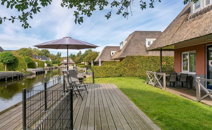 Bungalow 6D6 has a furnished patio with a parasol and a jetty.