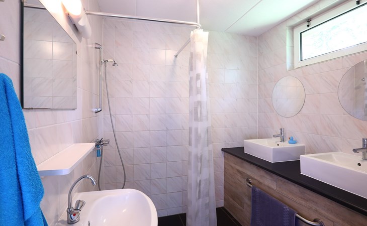 There are two bathrooms on the ground floor. One of the bathrooms has a shower and a washbasin. The other bathroom has a bathtub and a washbasin. In addition, there are two separate toilets.