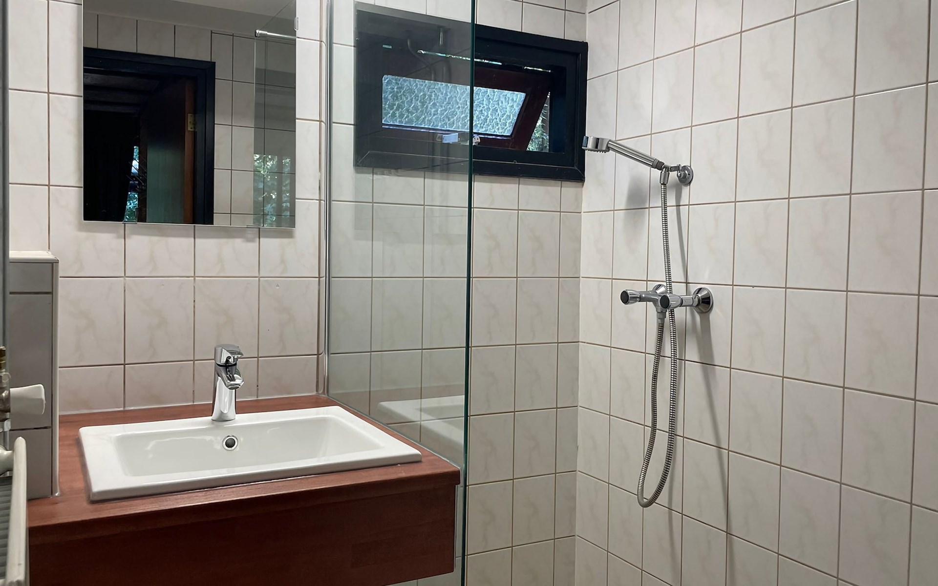 On the ground floor there are two bedrooms, one bathroom and a separate toilet. Both bedrooms have two single beds. The bathroom has a walk-in shower and a washbasin.