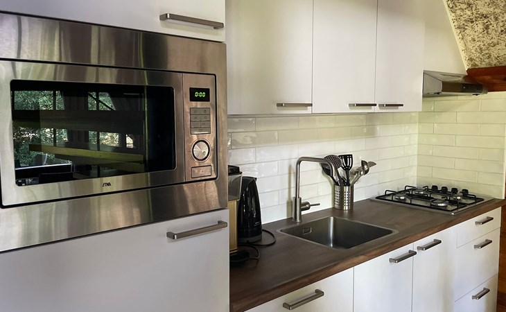 The open kitchen with dining area has a fridge with freezer compartment, filter coffee maker and combination microwave. The living room is furnished with a seating area, a television and a fireplace.