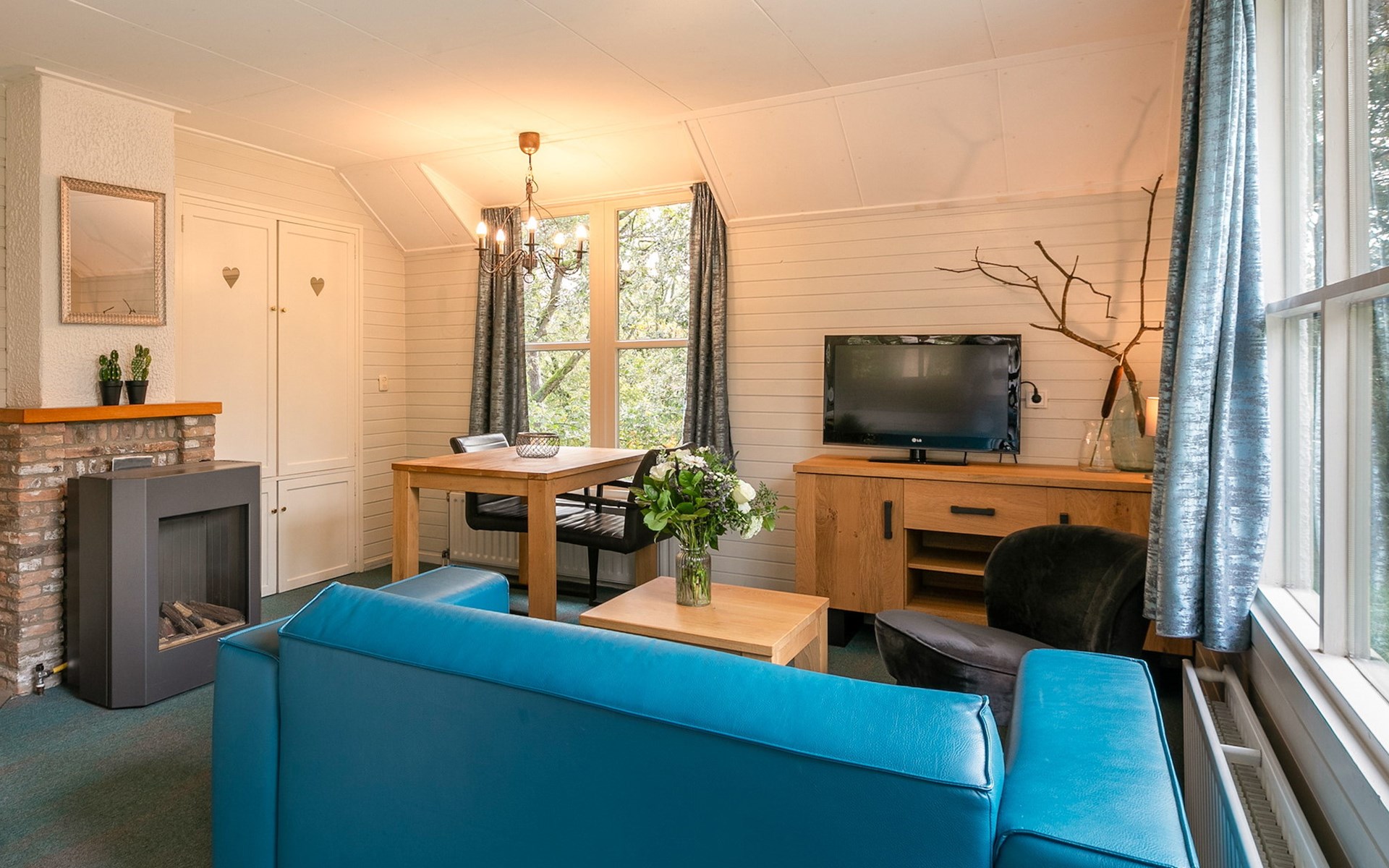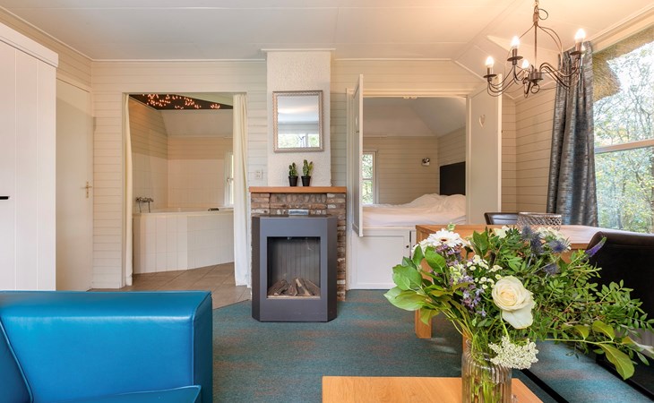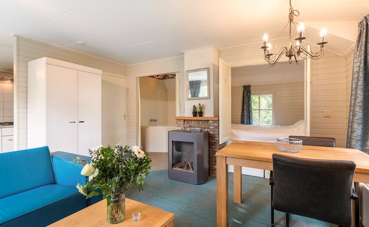 The living room is furnished with a seating area, television, decorative fireplace and a double bedstead. The bungalow has an open kitchen with a dining area. The kitchen appliances include a fridge with freezer compartment, Senseo coffee machine, combination microwave and a dishwasher.