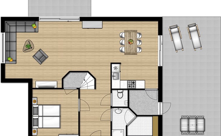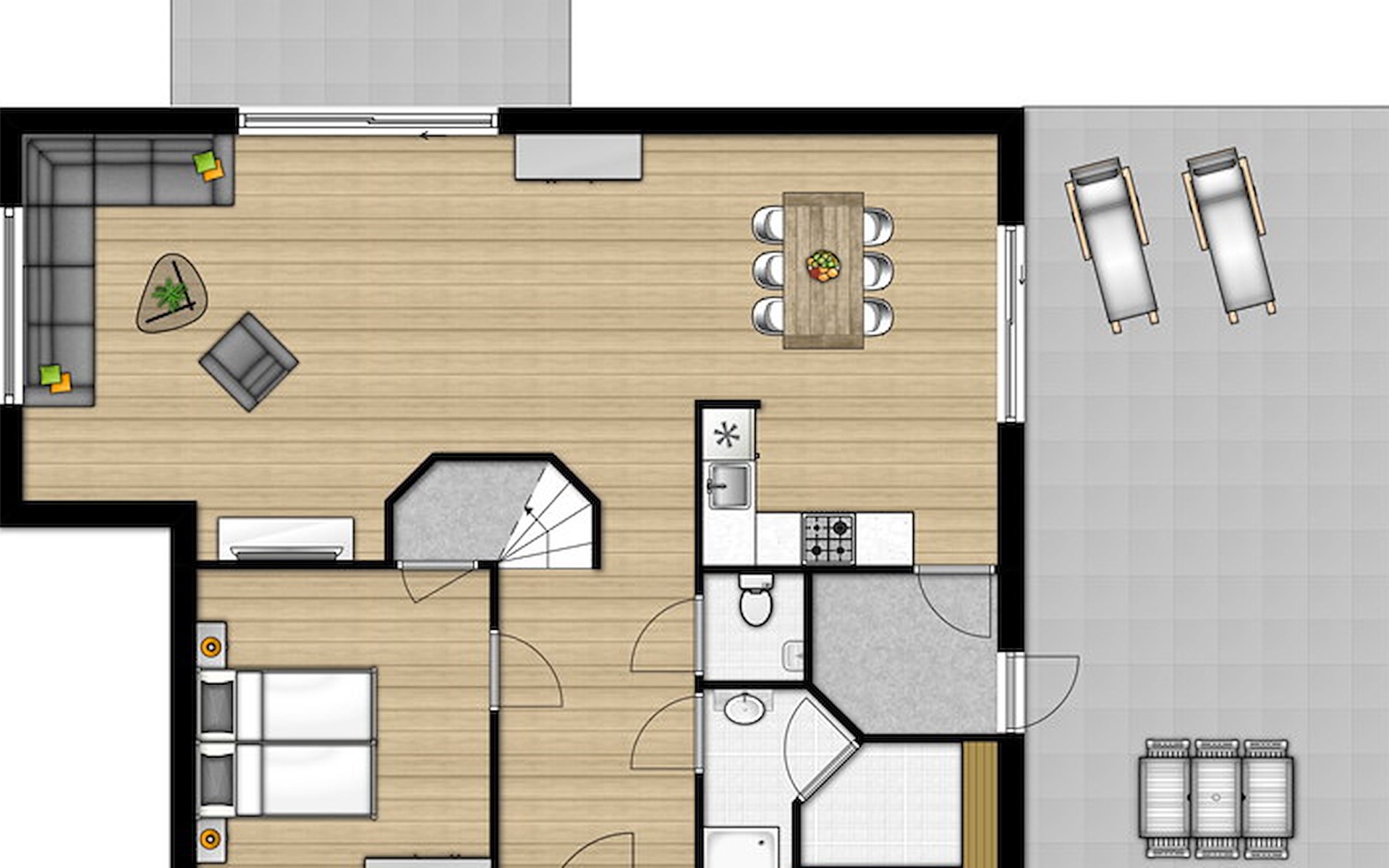 The detached bungalow B6 Comfort at Summio Zeeland Village is suitable for up to 6 persons. This comfortable bungalow has four bedrooms and two bathrooms, spread over two floors.