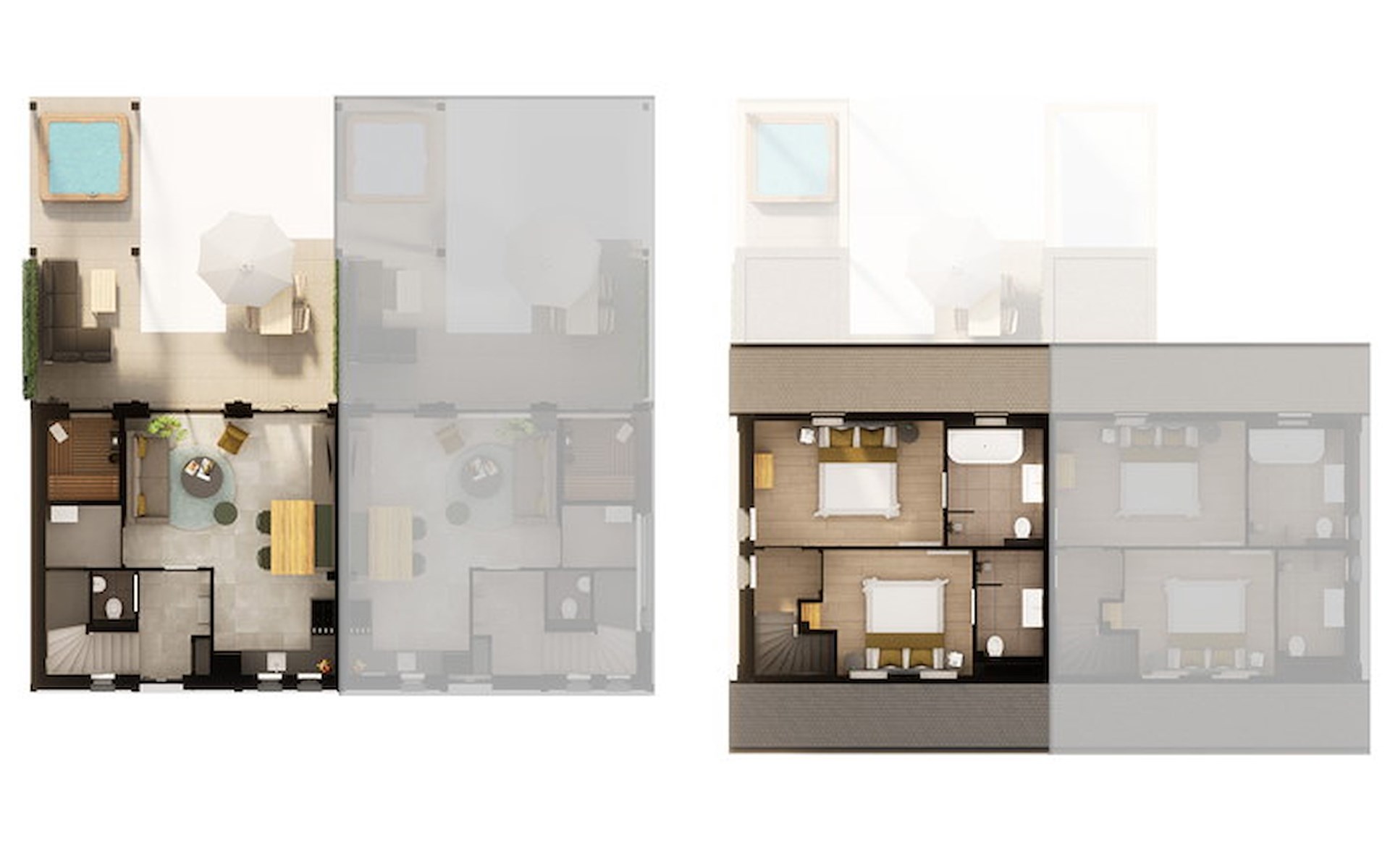 The spacious lounge features a cosy seating area with a smart TV with streaming capability. Moreover, there is a dining area and a modern open-plan kitchen with luxury appliances, including a Bora hob, combi-oven, dishwasher, Nespresso machine and a wine cooler. The ground floor also has a separate toilet and storage area.