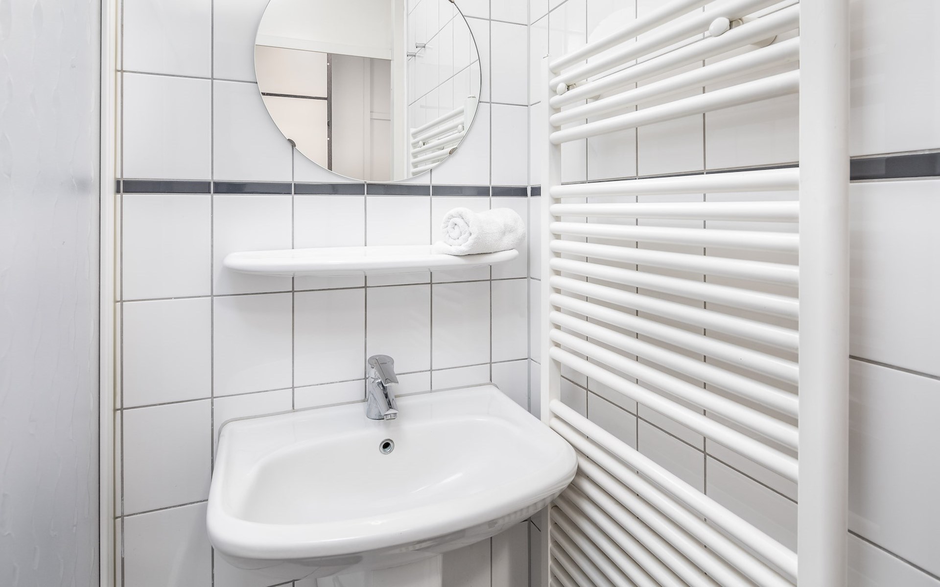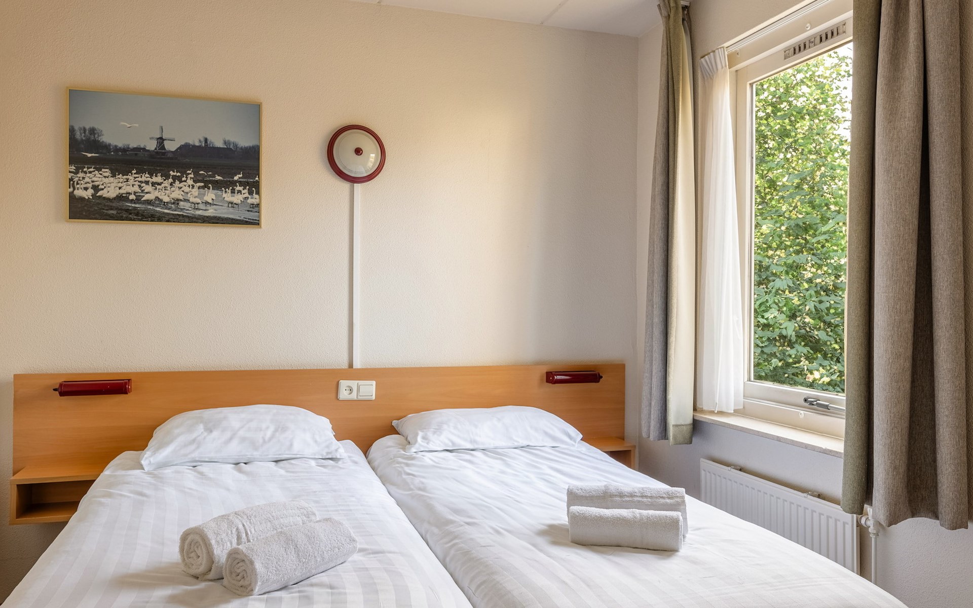 On the ground floor there is one bedroom and one bathroom. The bedroom has two single box spring beds. The bathroom has a shower and a washbasin. There is also a separate toilet.