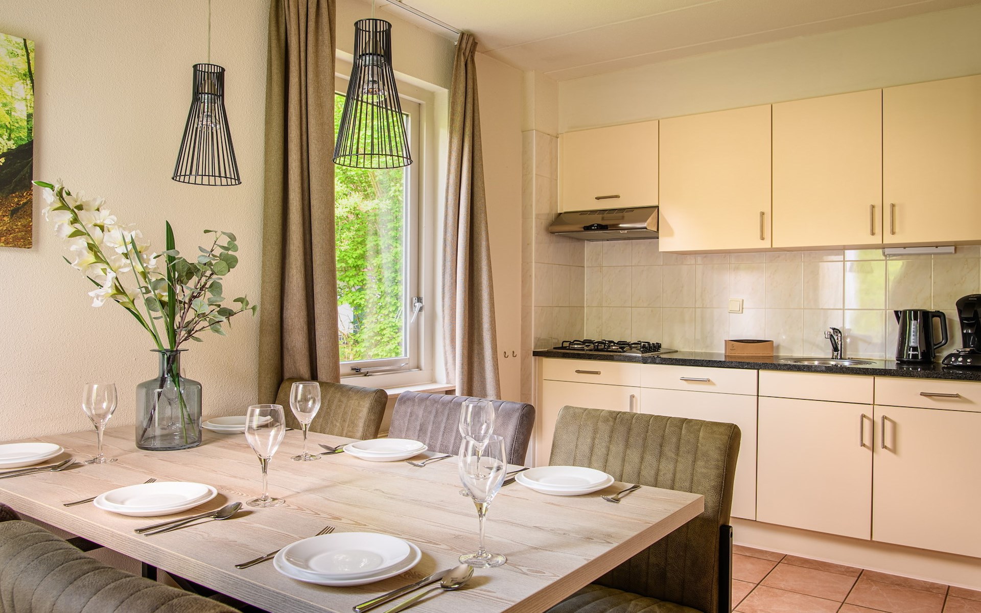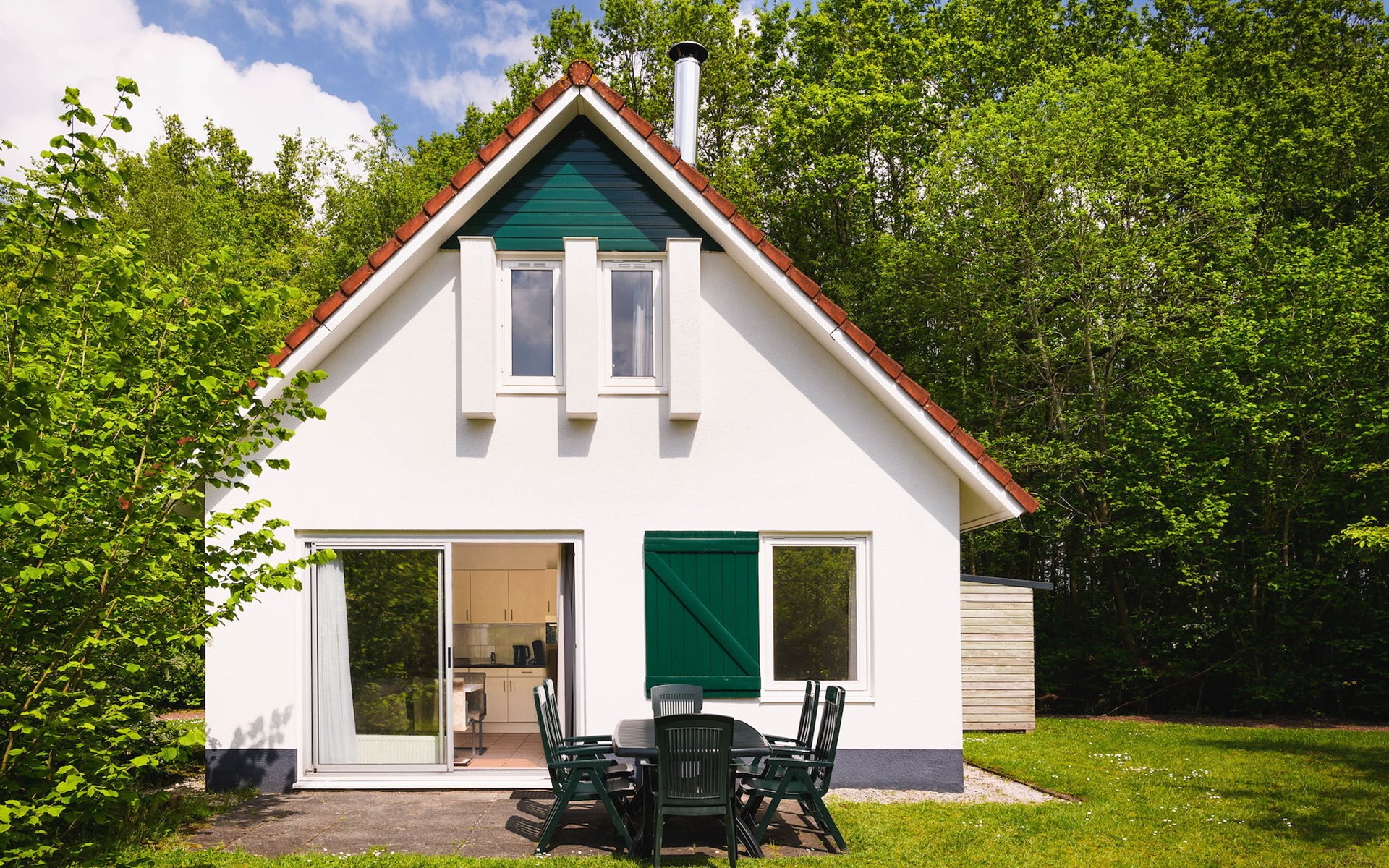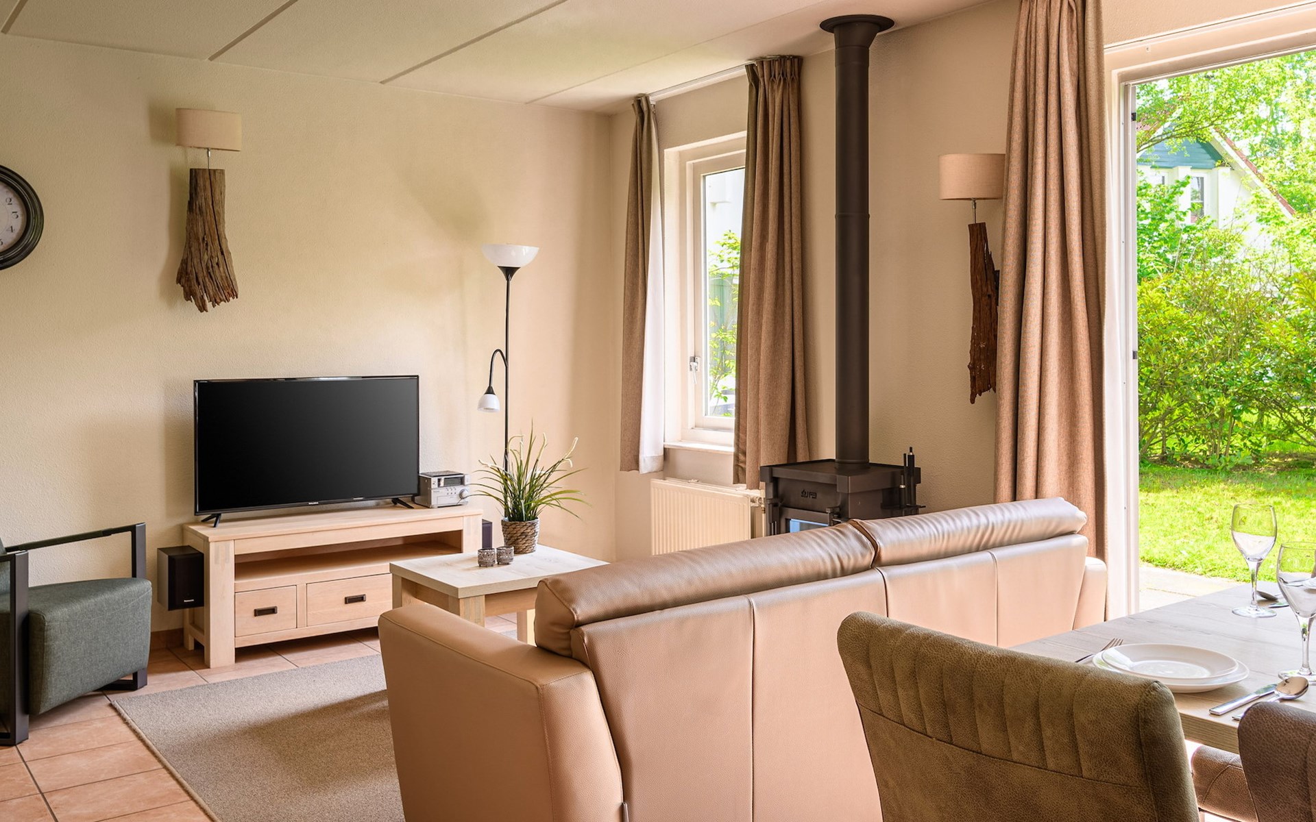 The bungalow has a garden with furnished patio, which you reach through the sliding doors in the living room.