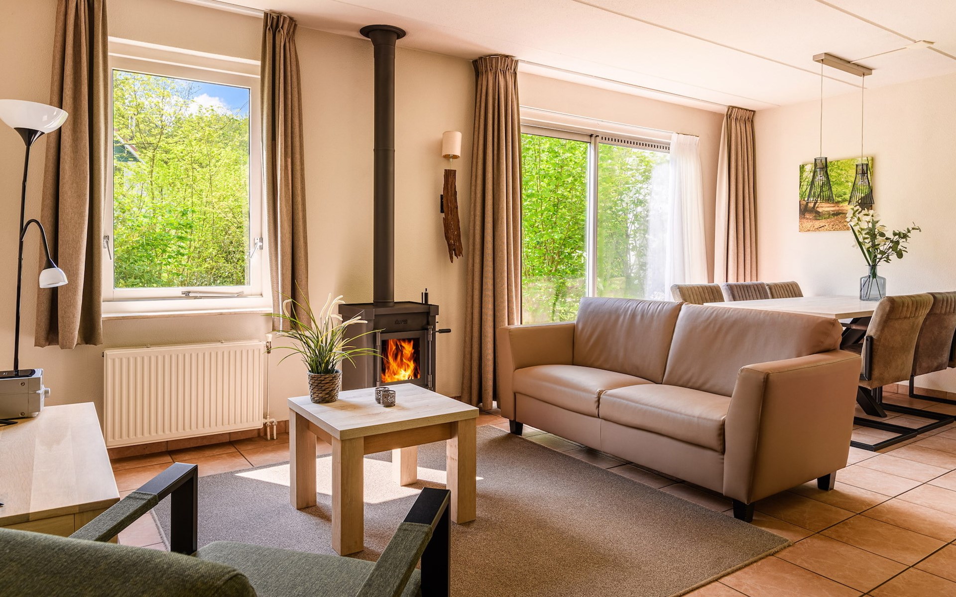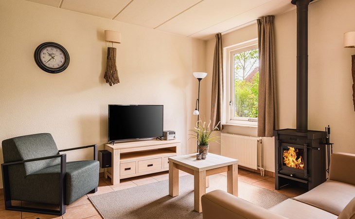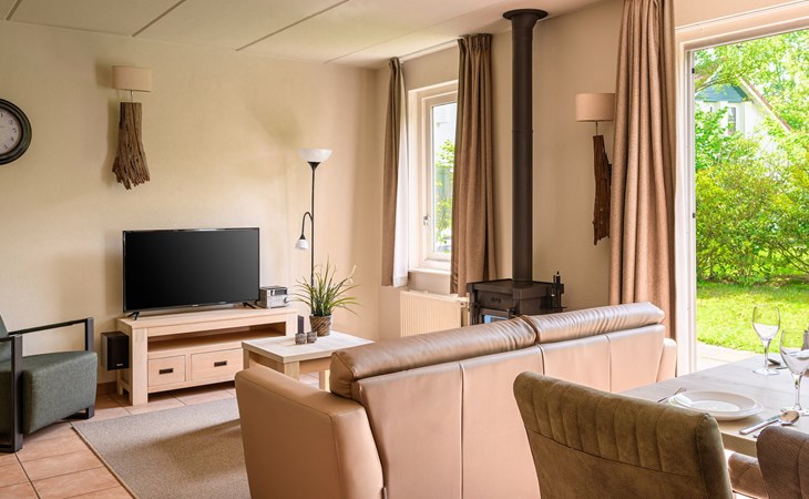 The living room is furnished with a dining area and a sitting area with a television and a wood-burning fireplace. The kitchen appliances include a fridge with freezer compartment, Senseo coffee machine, filter coffee machine, combination microwave and a dishwasher. The bungalow has an open storage room with a charging point for electric bicycles.