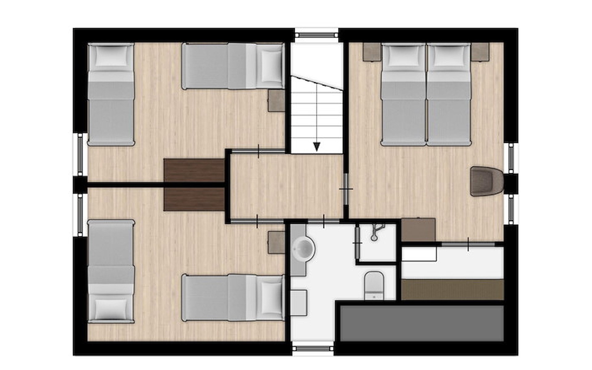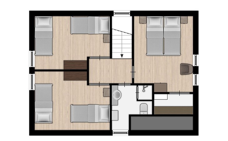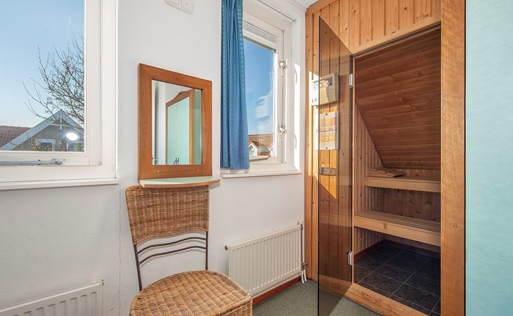 On the first floor there are three bedrooms, each with two single box spring beds. One of the bedrooms gives access to a traditional sauna. The bathroom on the first floor has a shower, washbasin and toilet.