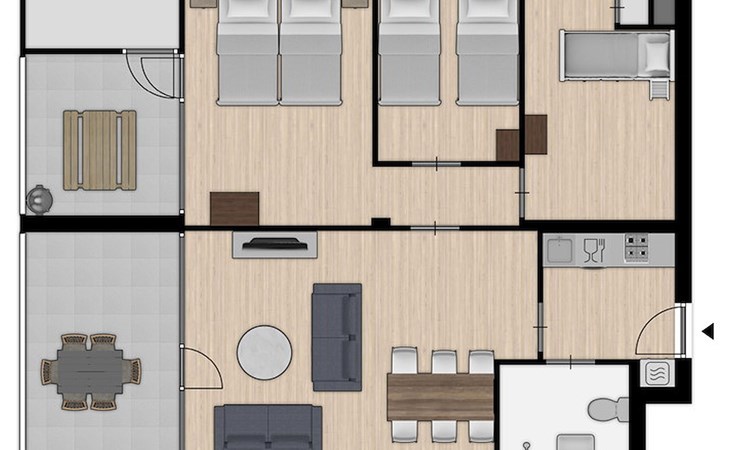 The ground floor apartment 6 at Summio Parc Aquadelta is suitable for up to 6 people. This child-friendly apartment has three bedrooms and one bathroom.